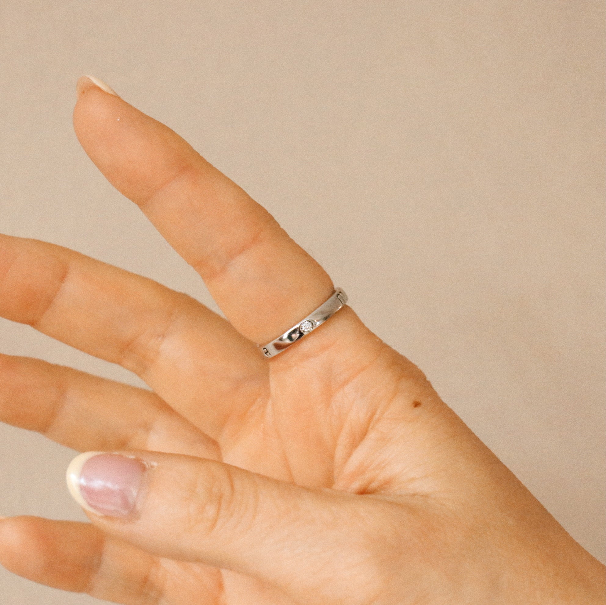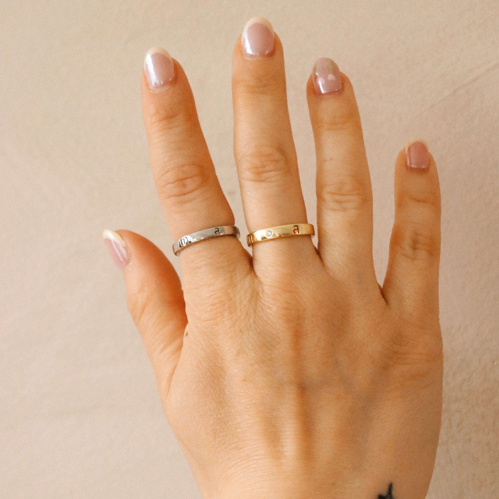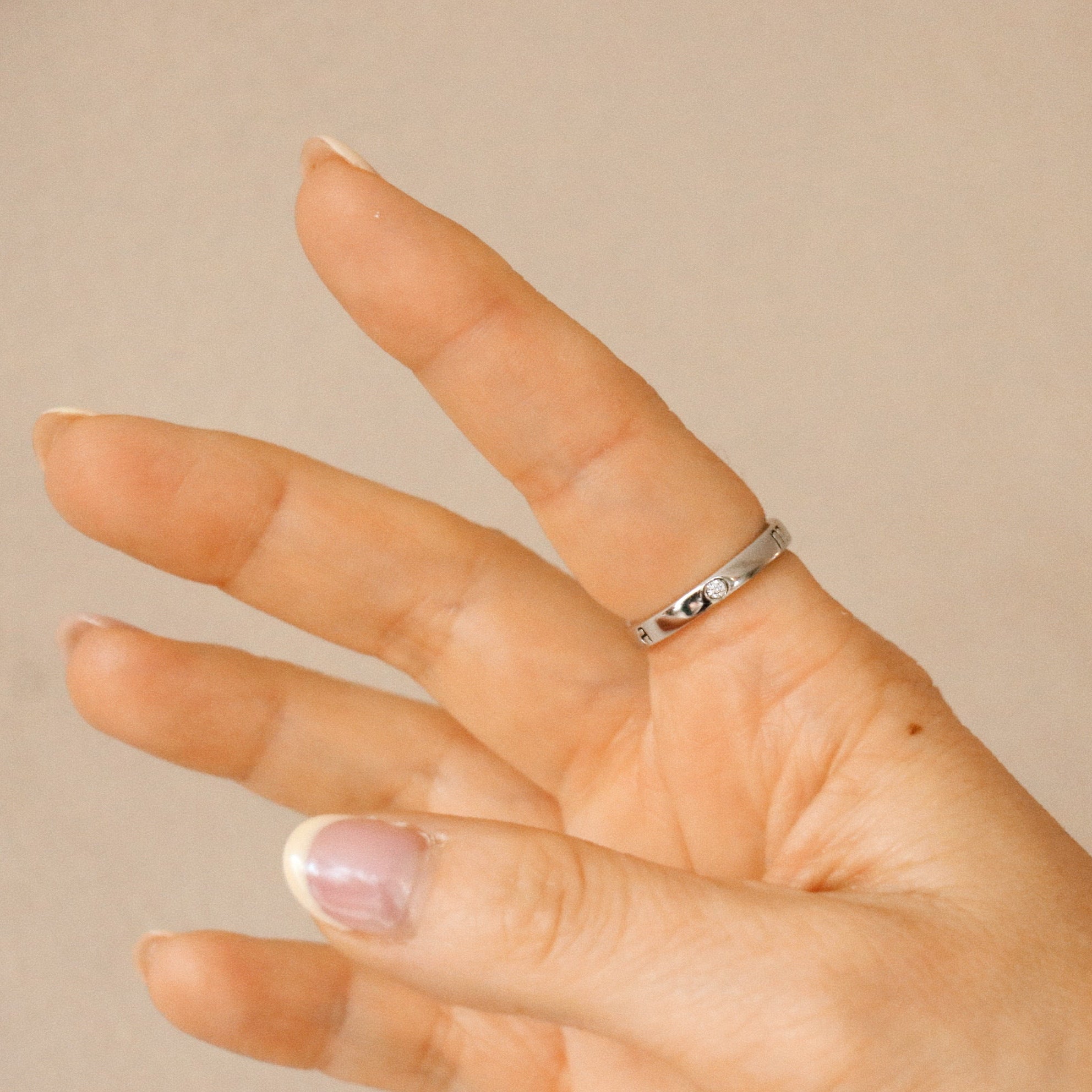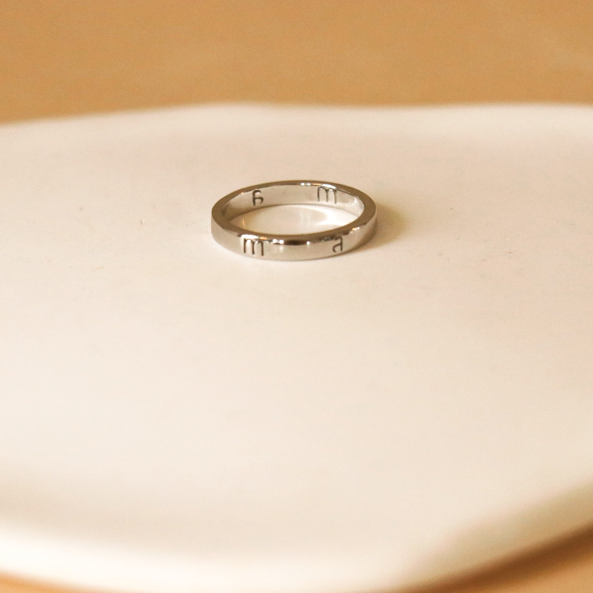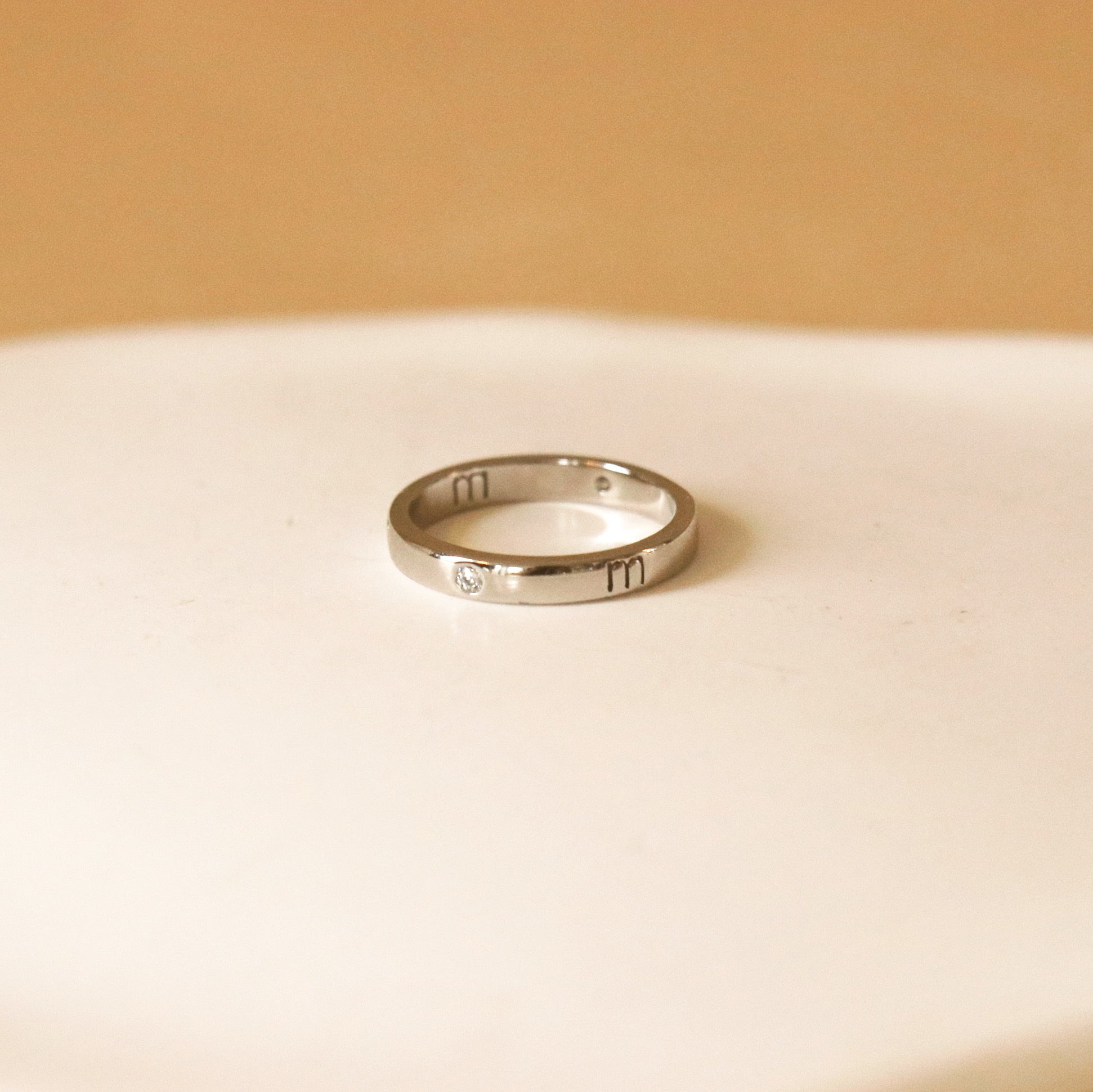 Band ring with the inscription "mama" around the band and two small inlaid zircons. Delicately cut engraving and a comfortable design.