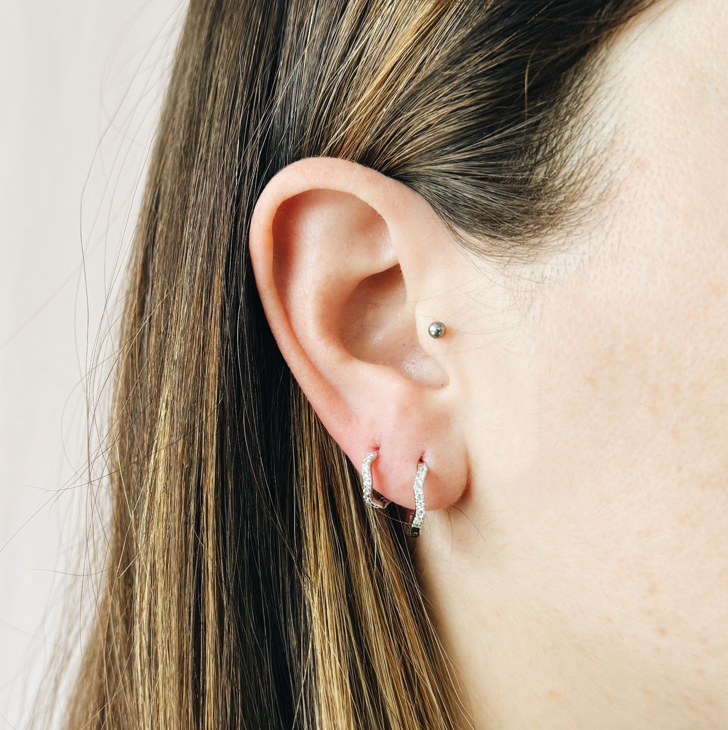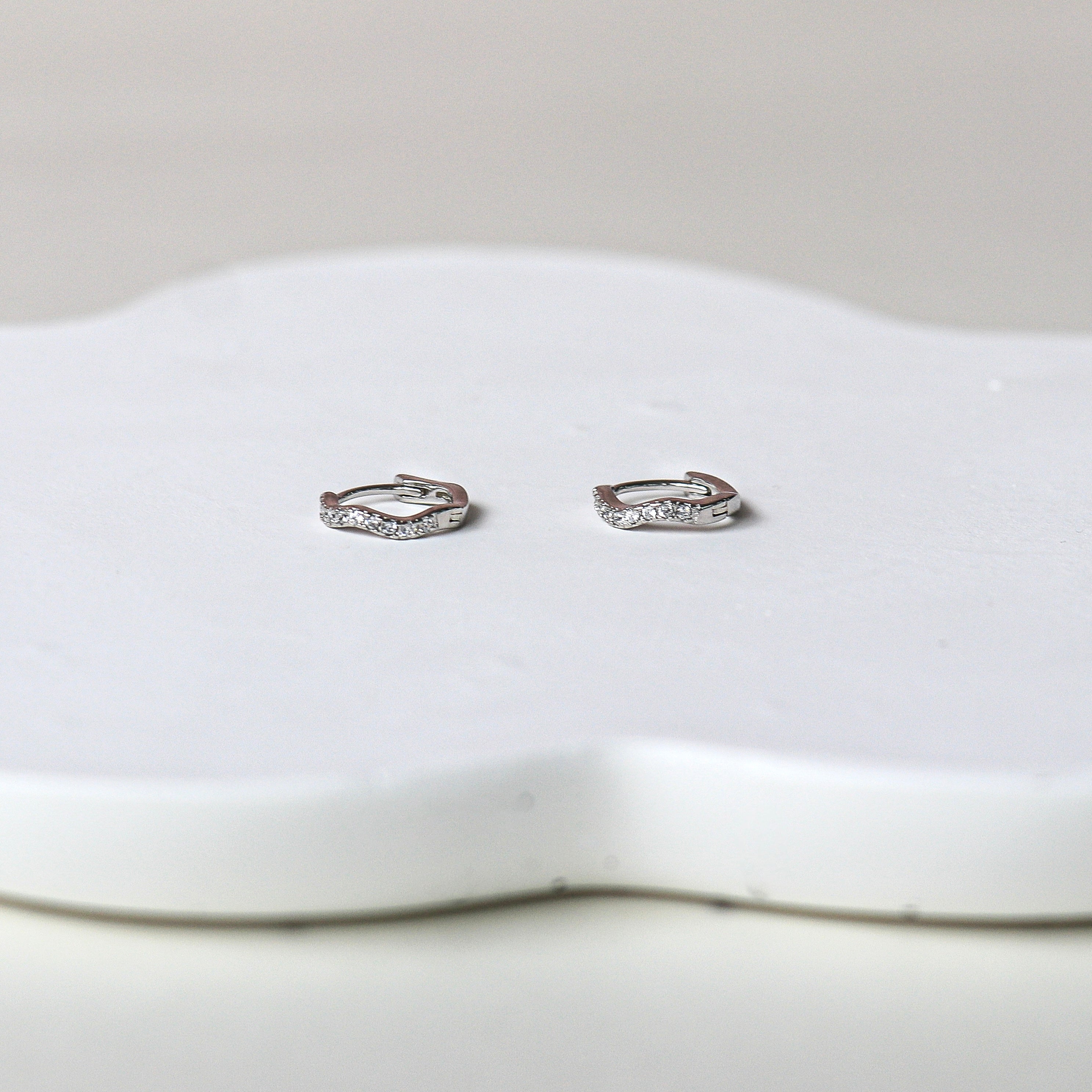 Sleeper earrings. These little wavy hoops are the perfect size to wear at your second lobe holes for a perfect stack! Set with tiny zircons, they'll add sparkle and originality to your ears.