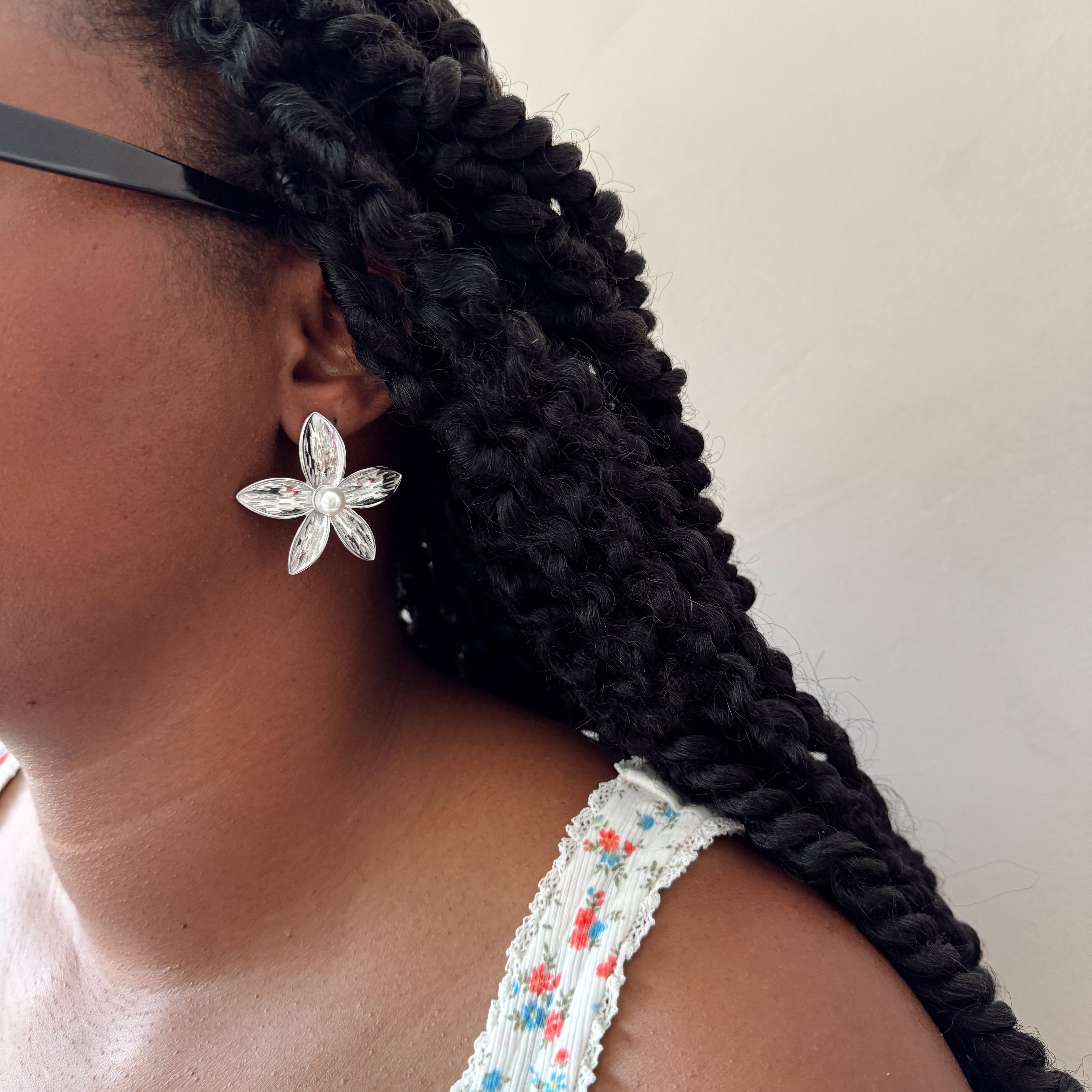 Flower-shaped stud earrings with a pearl center. Petals with engraved details.
