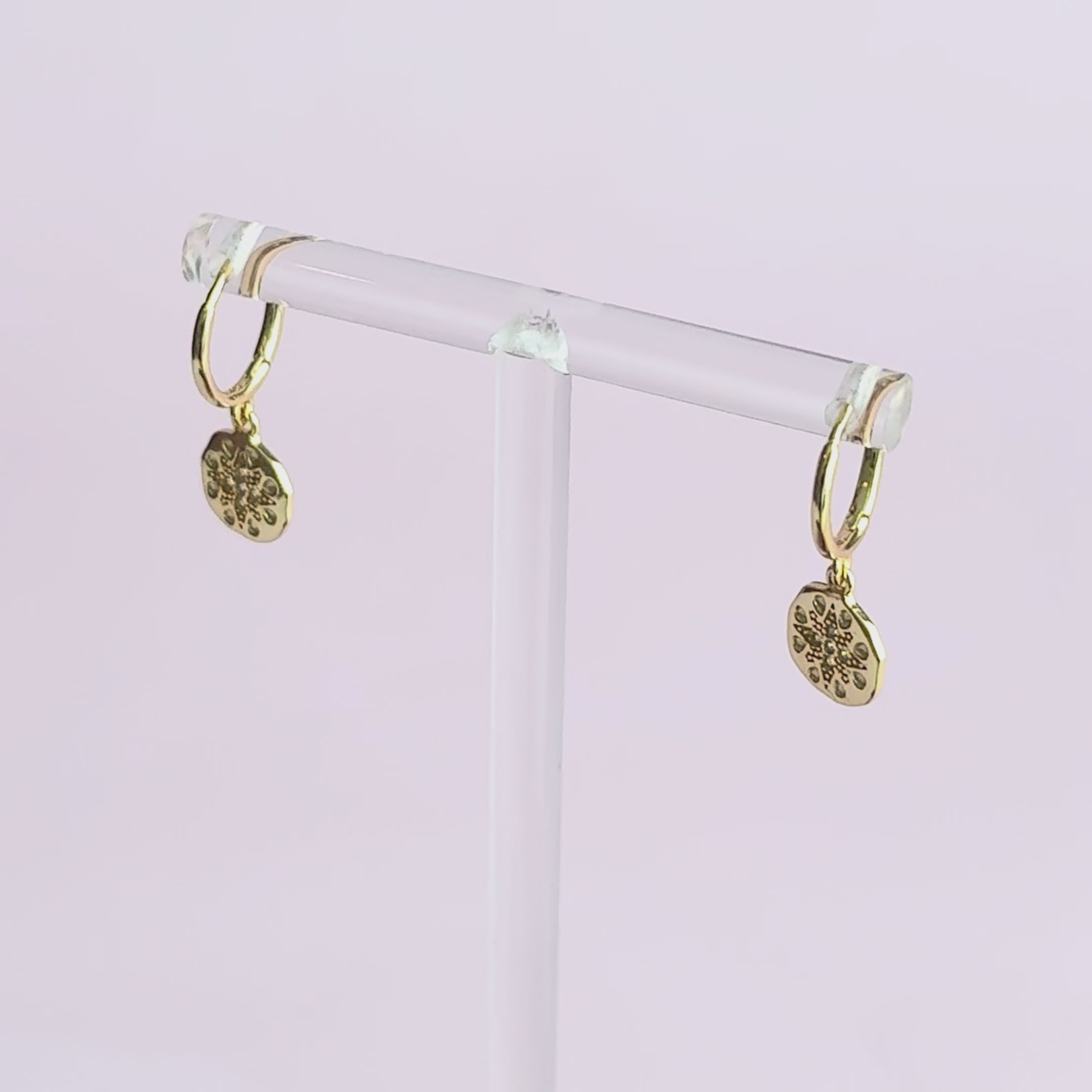Delicate earrings with a sleeper type hoop. Small sparkling pendant attached to the ring.