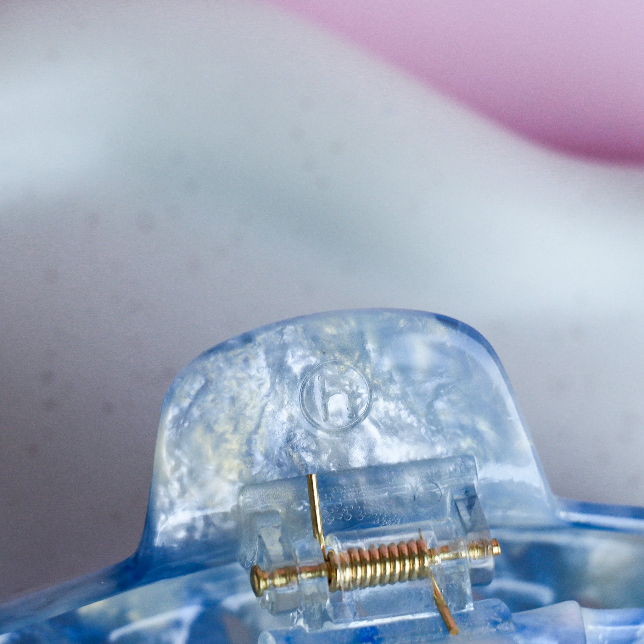 Rounded hair clip with a cutout in the center, in slightly transparent shades of blue. Holds all hair types in place.