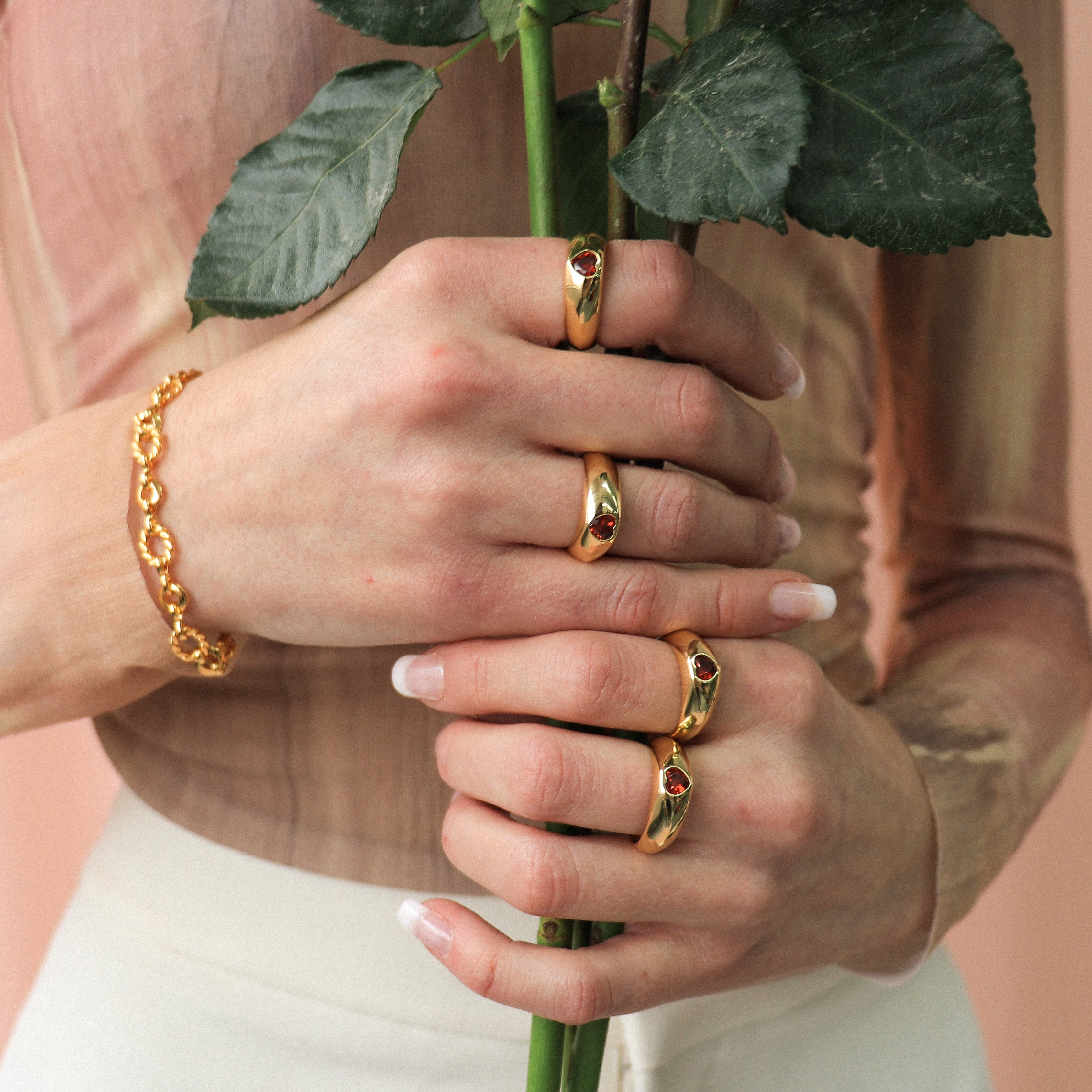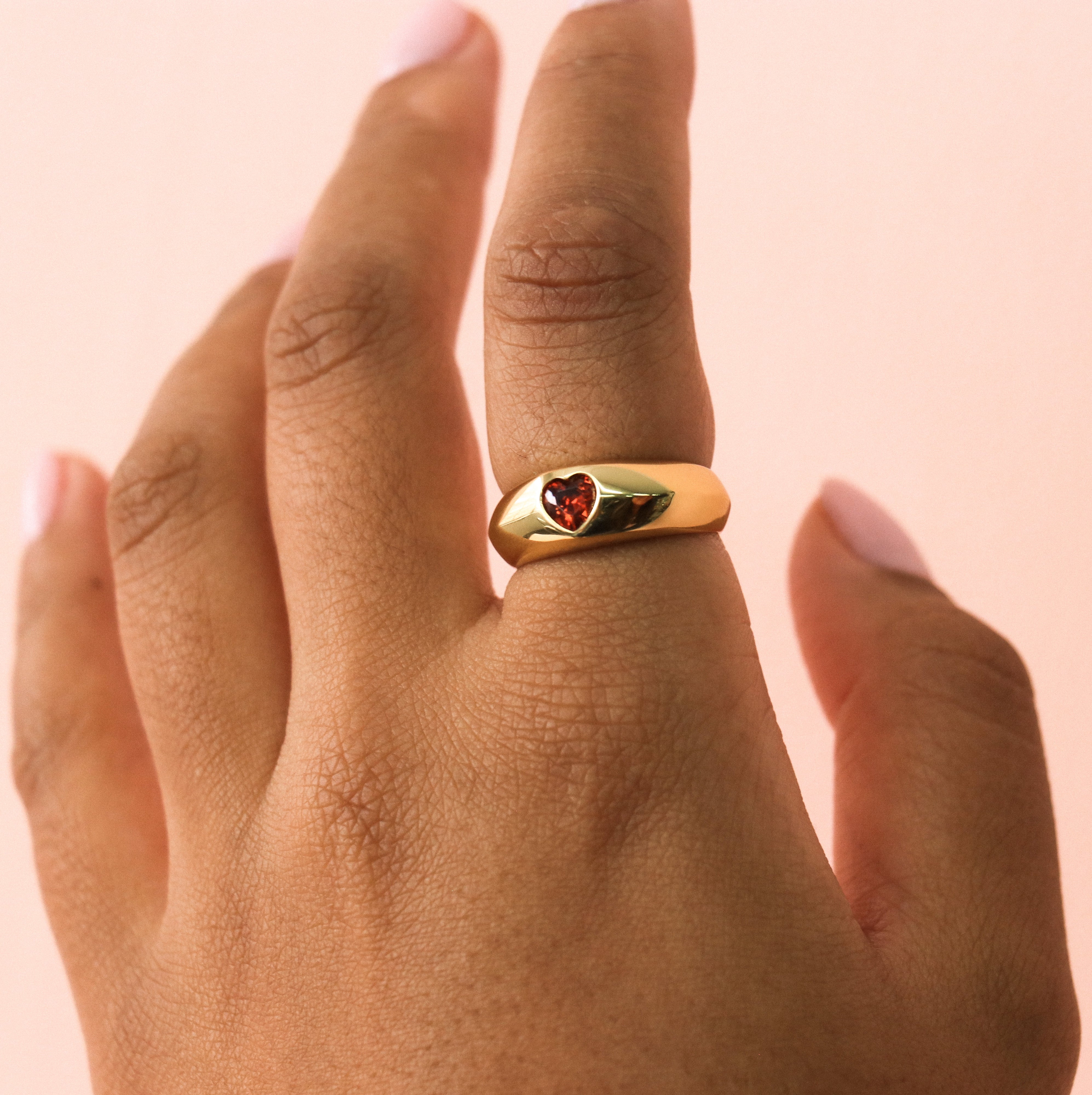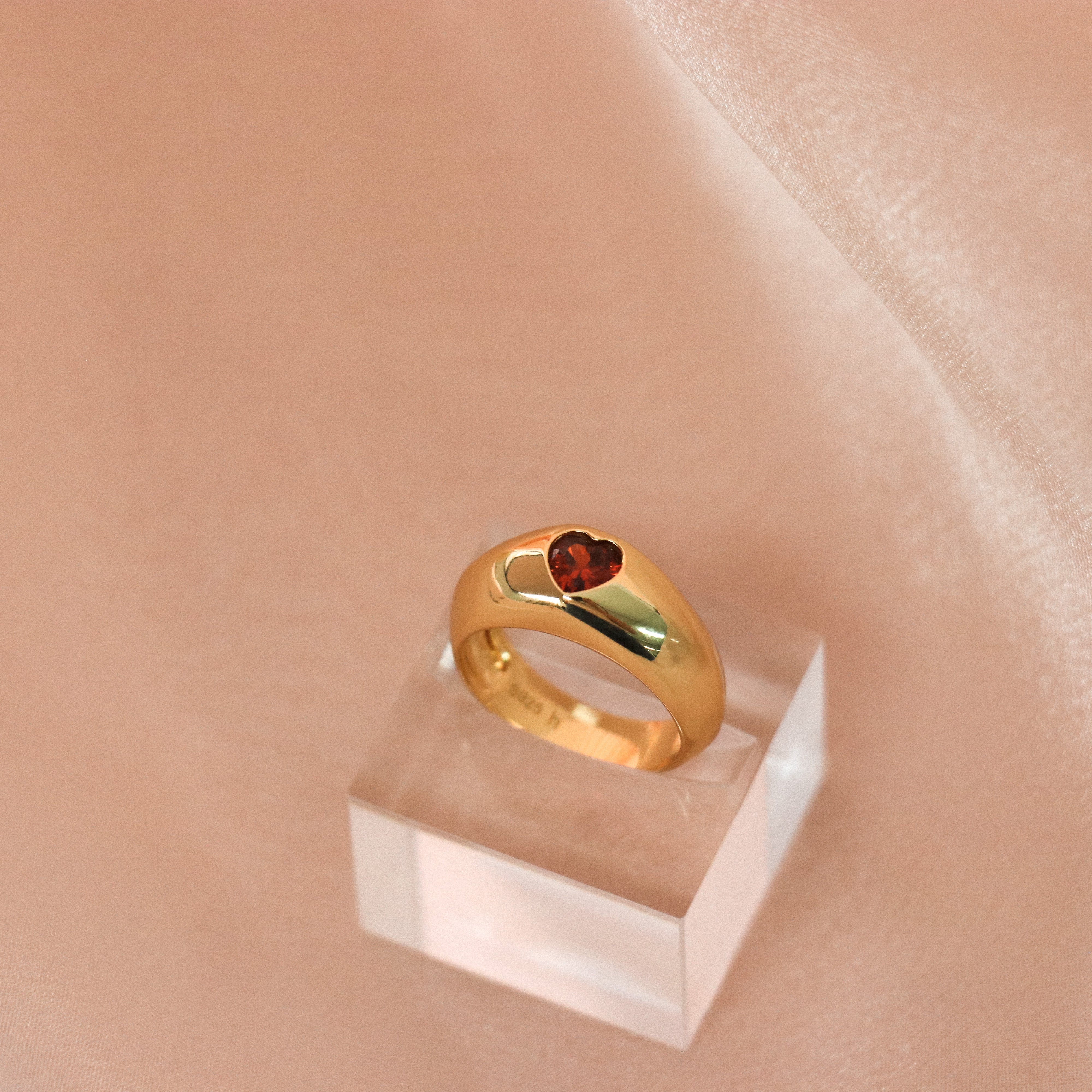 This ring will charm you by its bold and romantic side. Dome style, it is adorned with a garnet colored zircon.