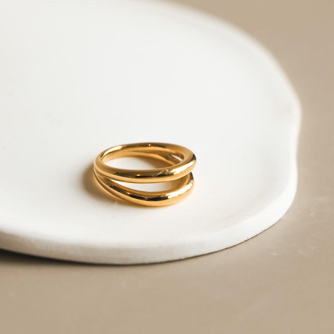 Double-effect ring featuring two connected bands. Pairs beautifully with all your rings and other jewelry.