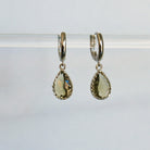 Sleeper-style earrings adorned with a drop-shaped pendant in olive-colored glass stone.