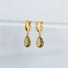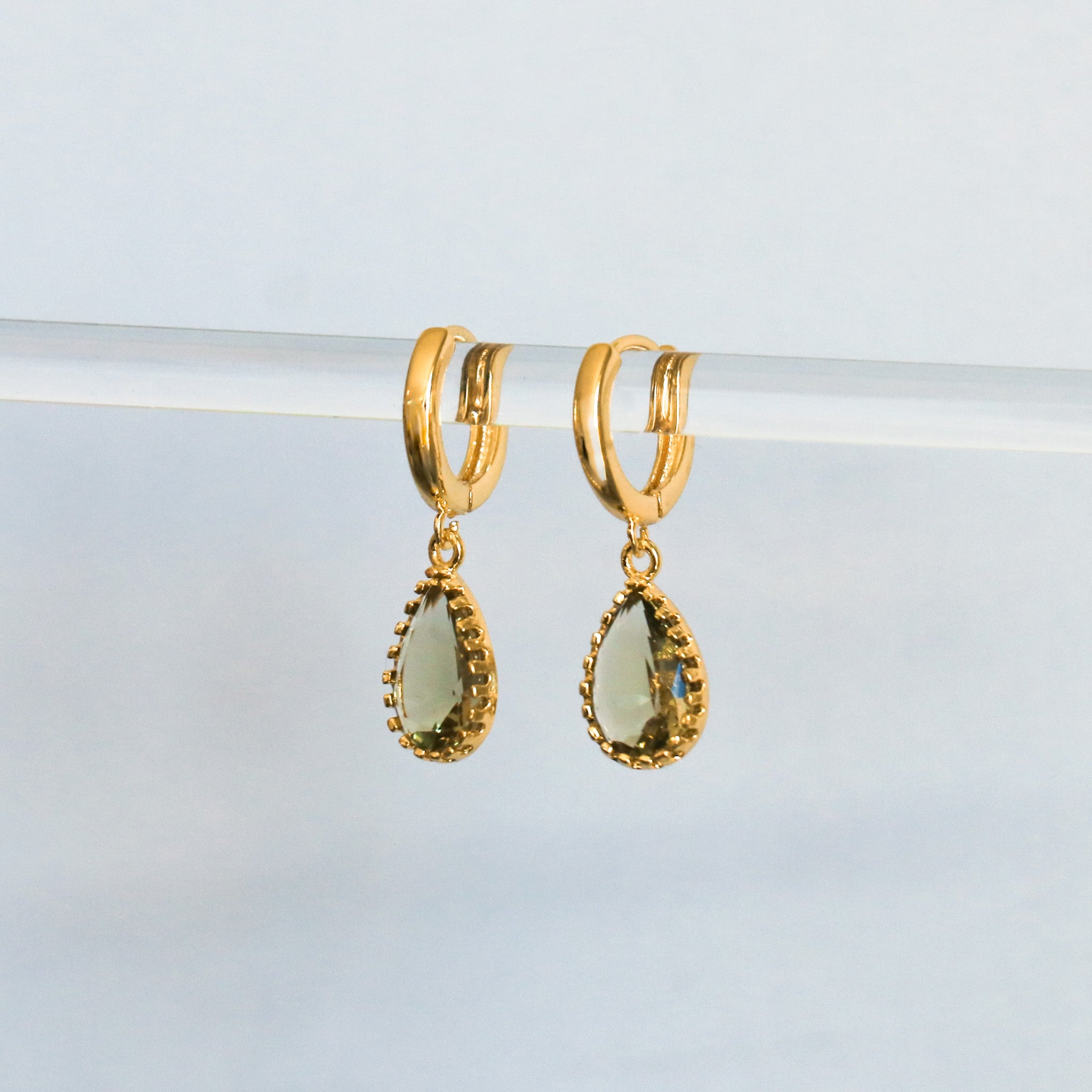 Sleeper-style earrings adorned with a drop-shaped pendant in olive-colored glass stone.