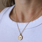 Delicate chain necklace with a slightly irregularly shaped pendant and a heart in its center.