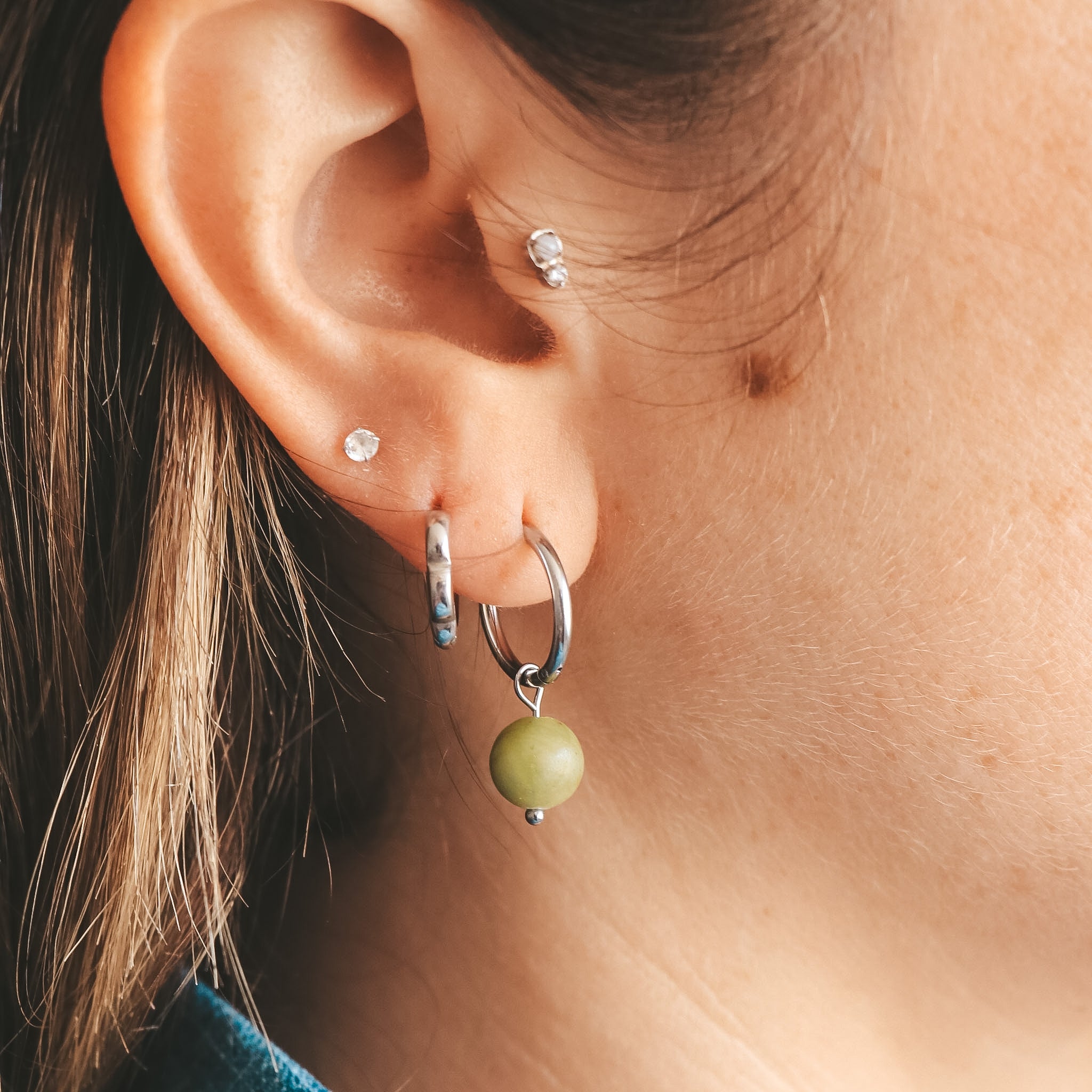 Hoop earrings with a round, green natural stone charm.