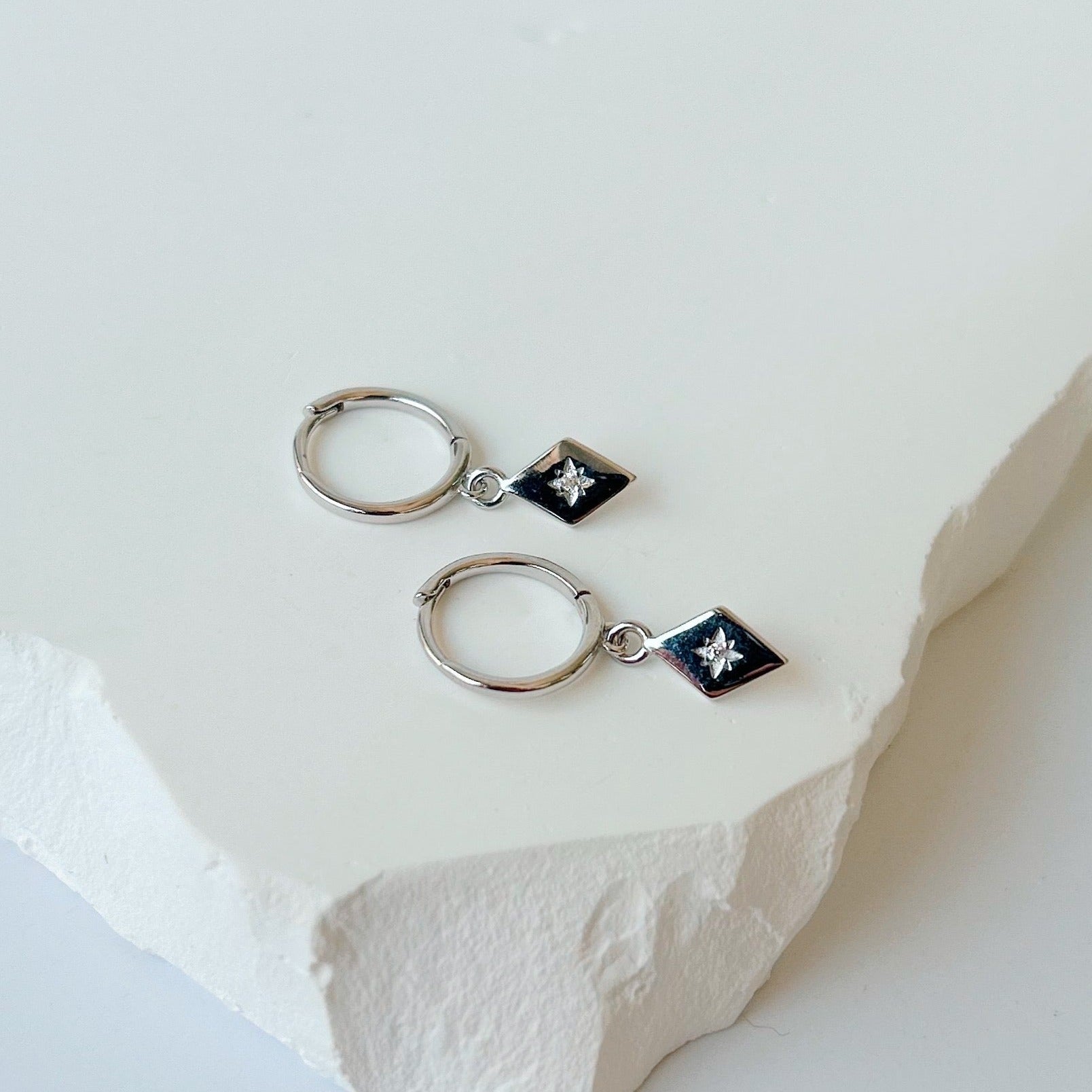 Delicate hoop earrings with diamond pendant and small inlaid zircon.