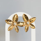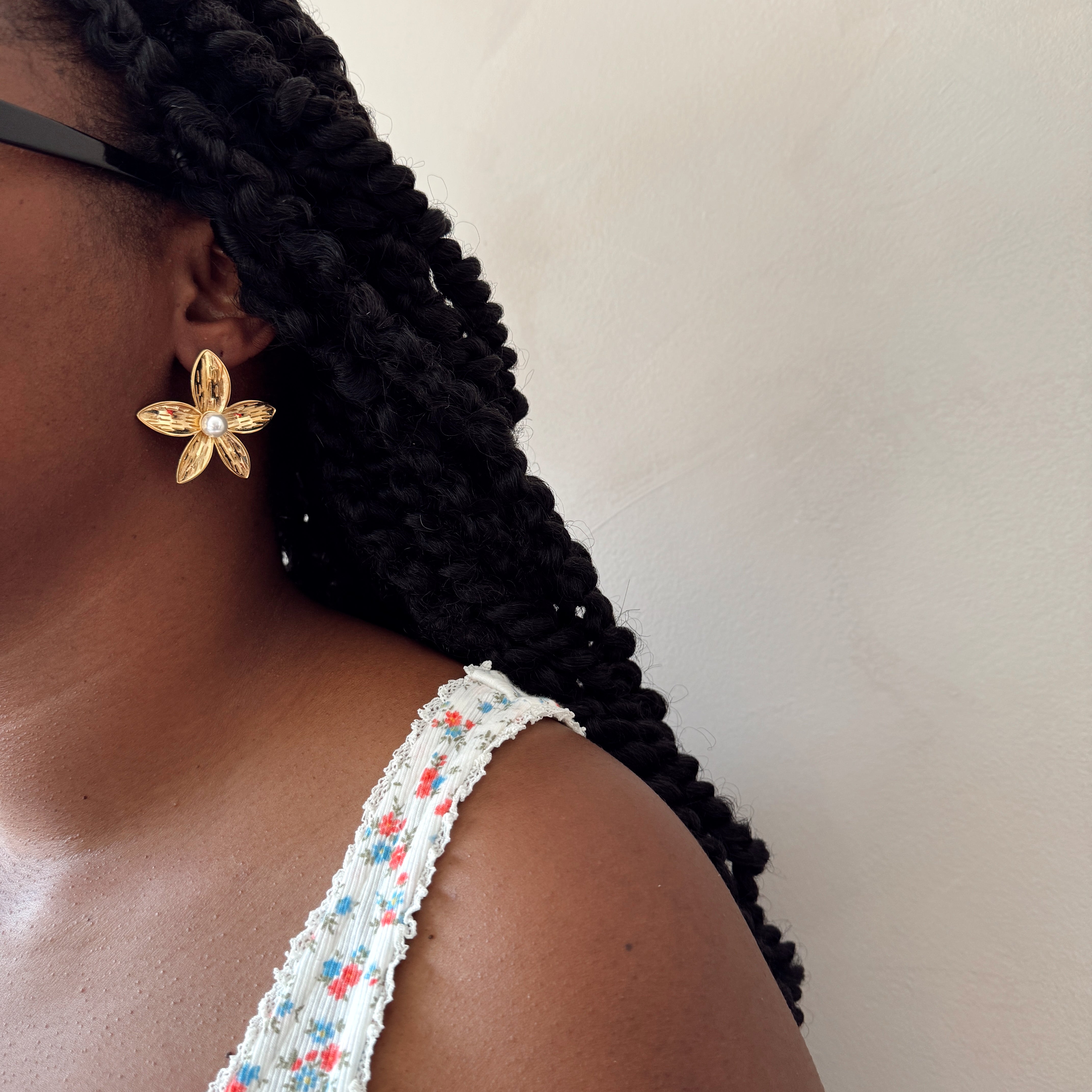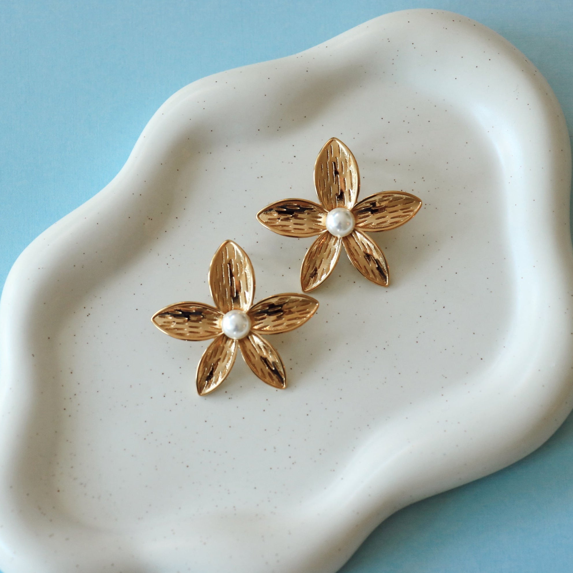 Flower-shaped stud earrings with a pearl center. Petals with engraved details.