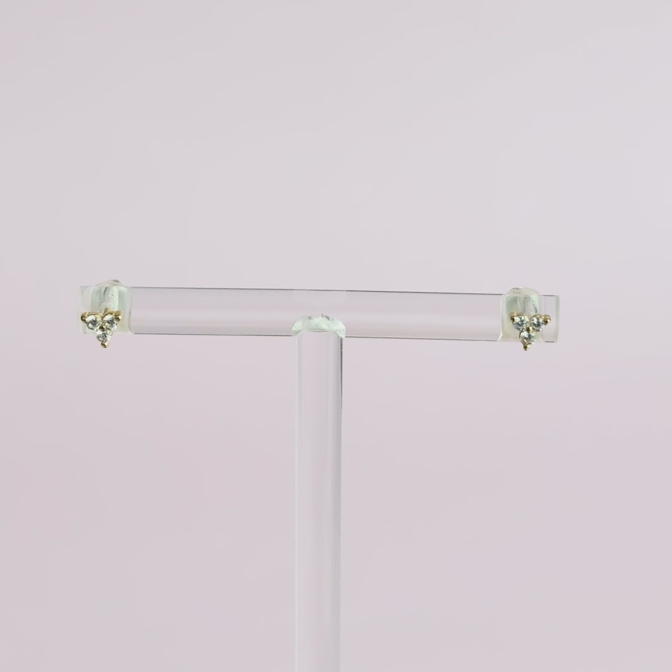 Small stud type earrings adorned with three white zircons forming a small triangle. Can be worn in the first, second or third lobe piercing holes. Versatile, they will go with all styles.