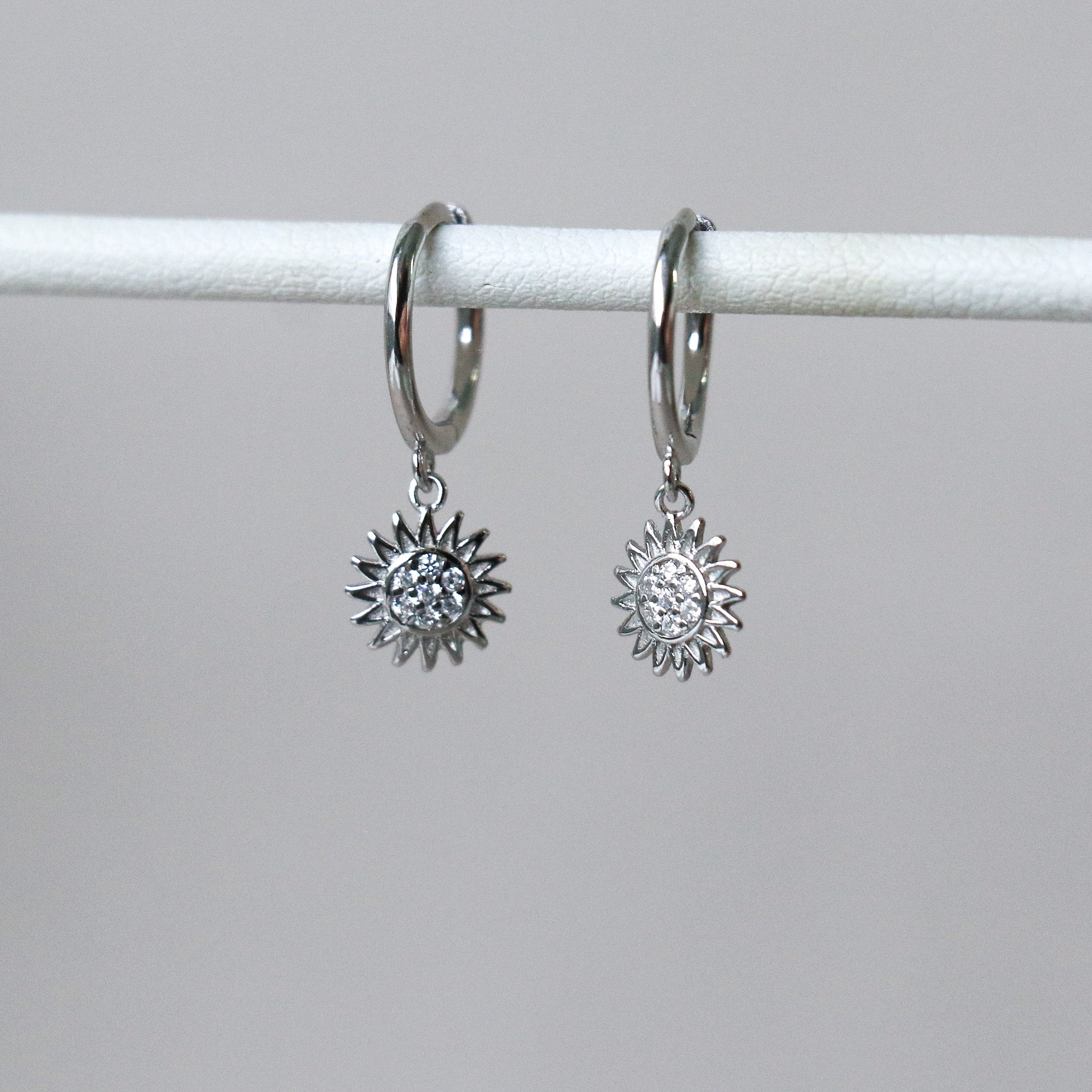 Sleeper hoop earrings with sunflower flower charm inlaid with small zircons.