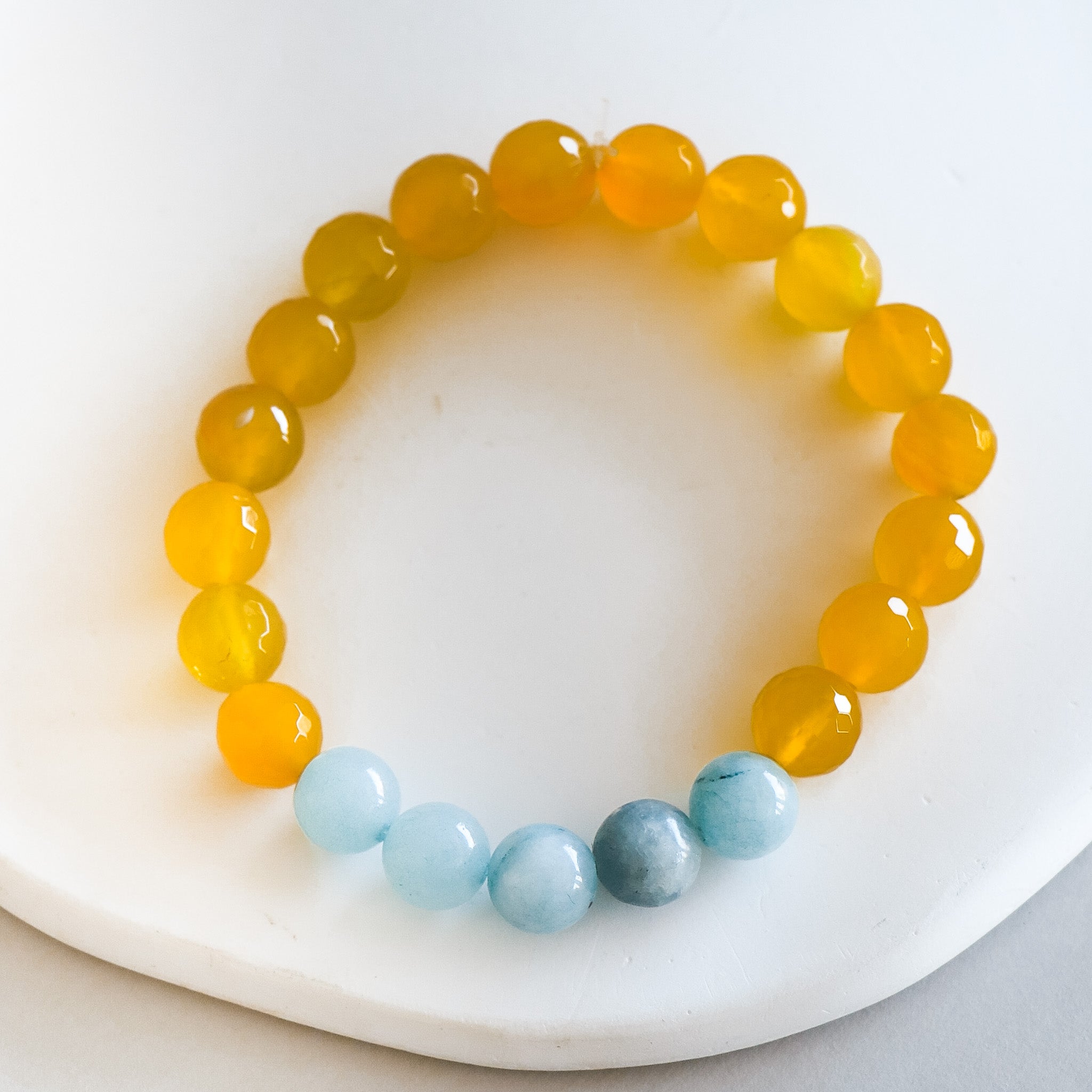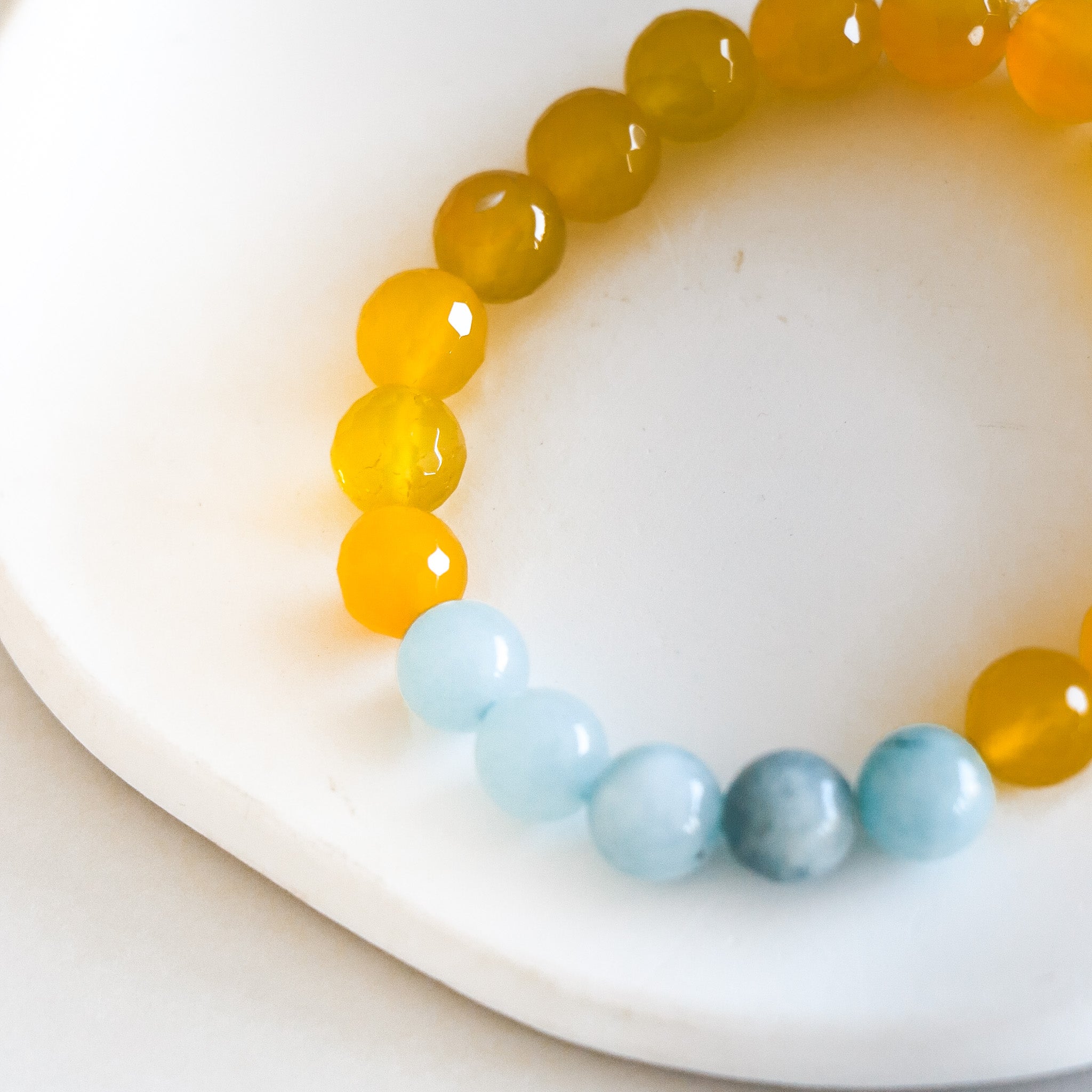 Bracelet made of mixed natural stone beads and resin in ochre yellow and blue-grey. Elastic cord.