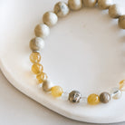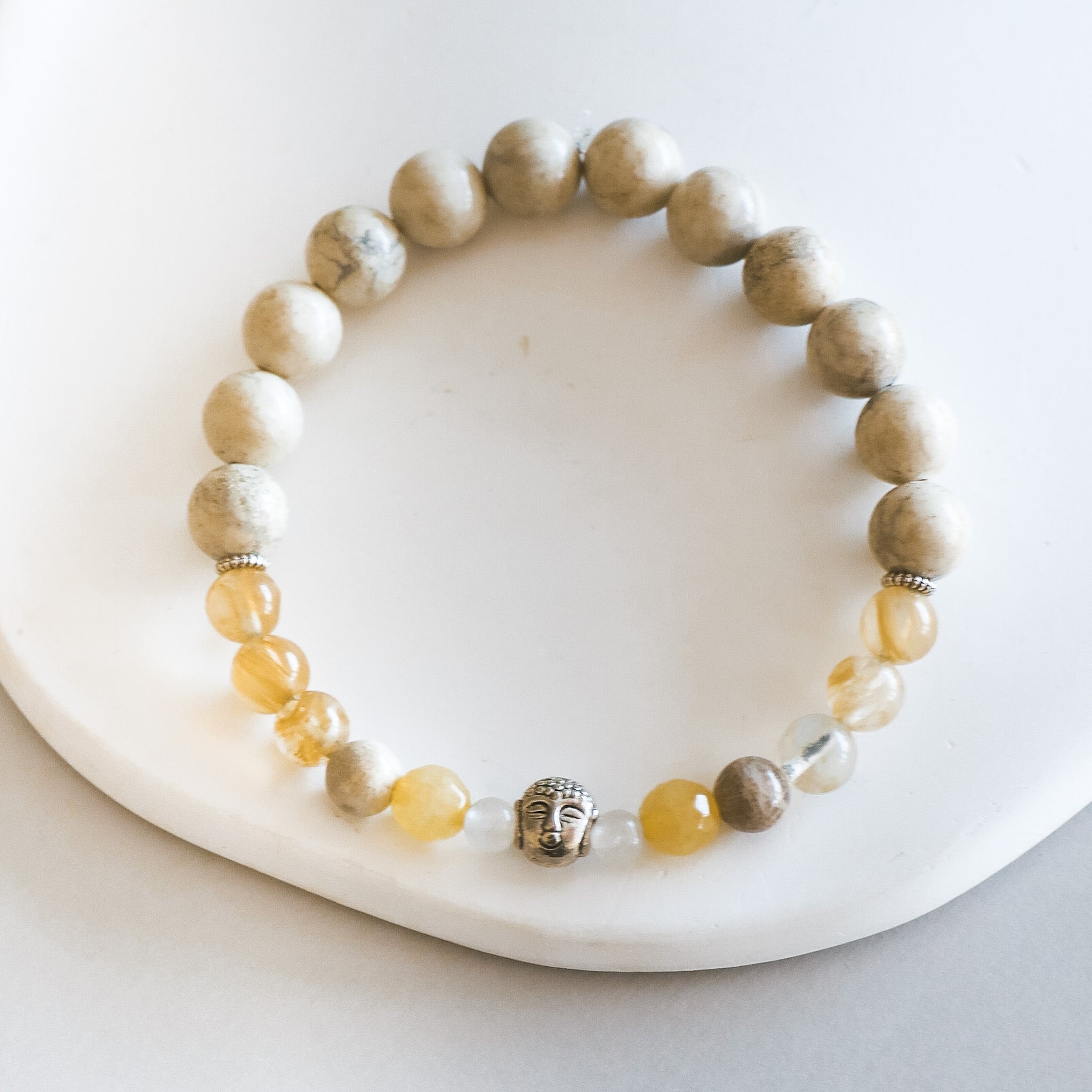 Bracelet made of mixed natural stone beads in shades of grey and beige. Features a small Buddha head bead and silver-colored details. Elastic cord.