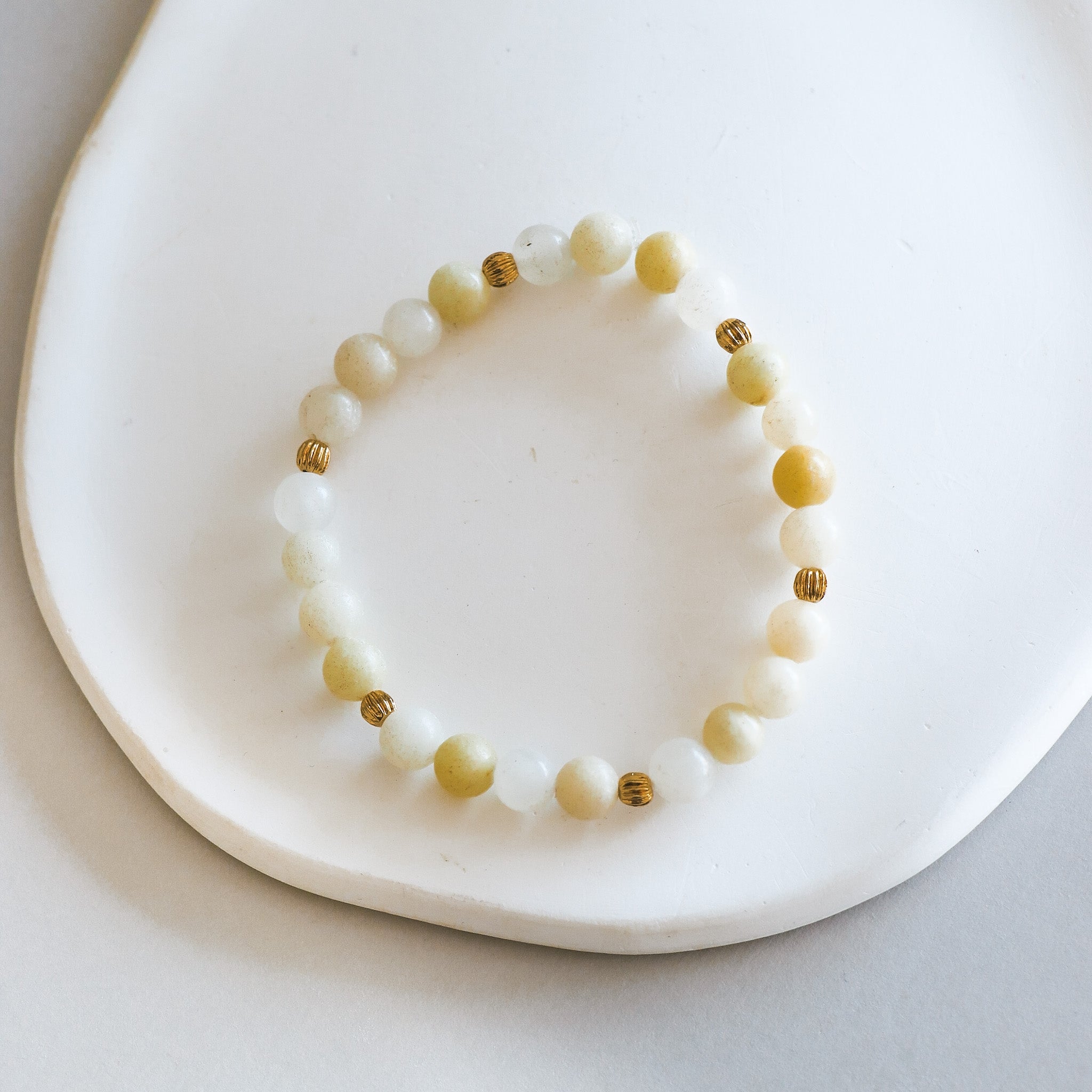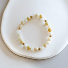 Bracelet made of mixed natural stone beads in shades of green and beige/brown. Elastic cord.