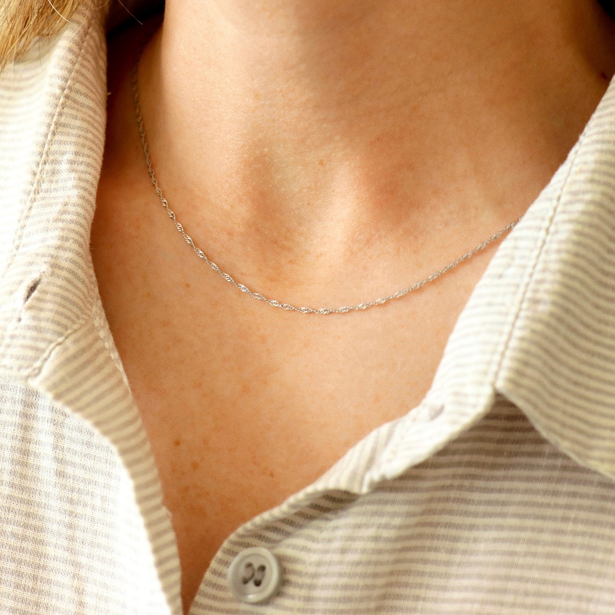 Fine and delicate Singapore-style cable-link chain. Sparkling and close to the neck, it will quickly become a favorite.