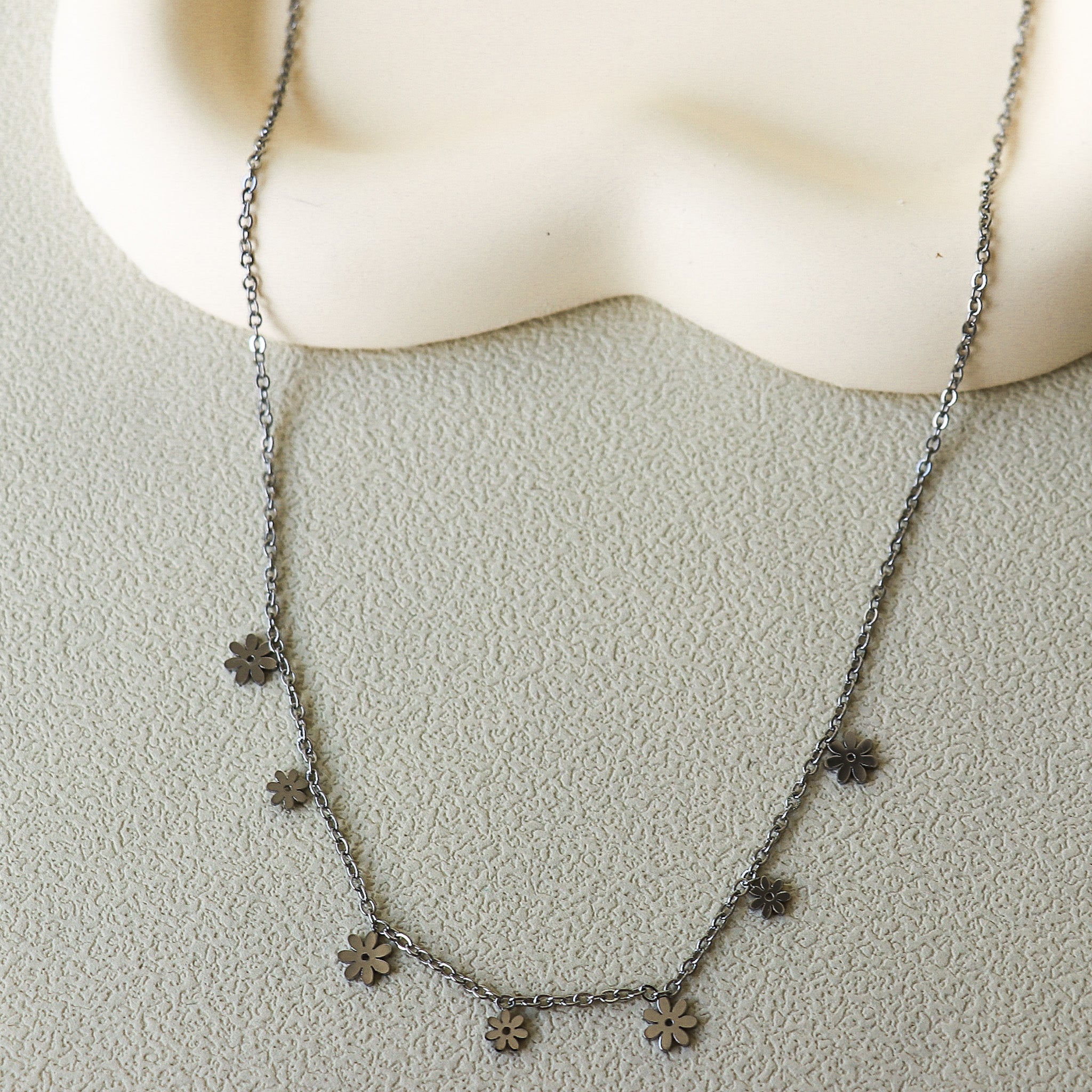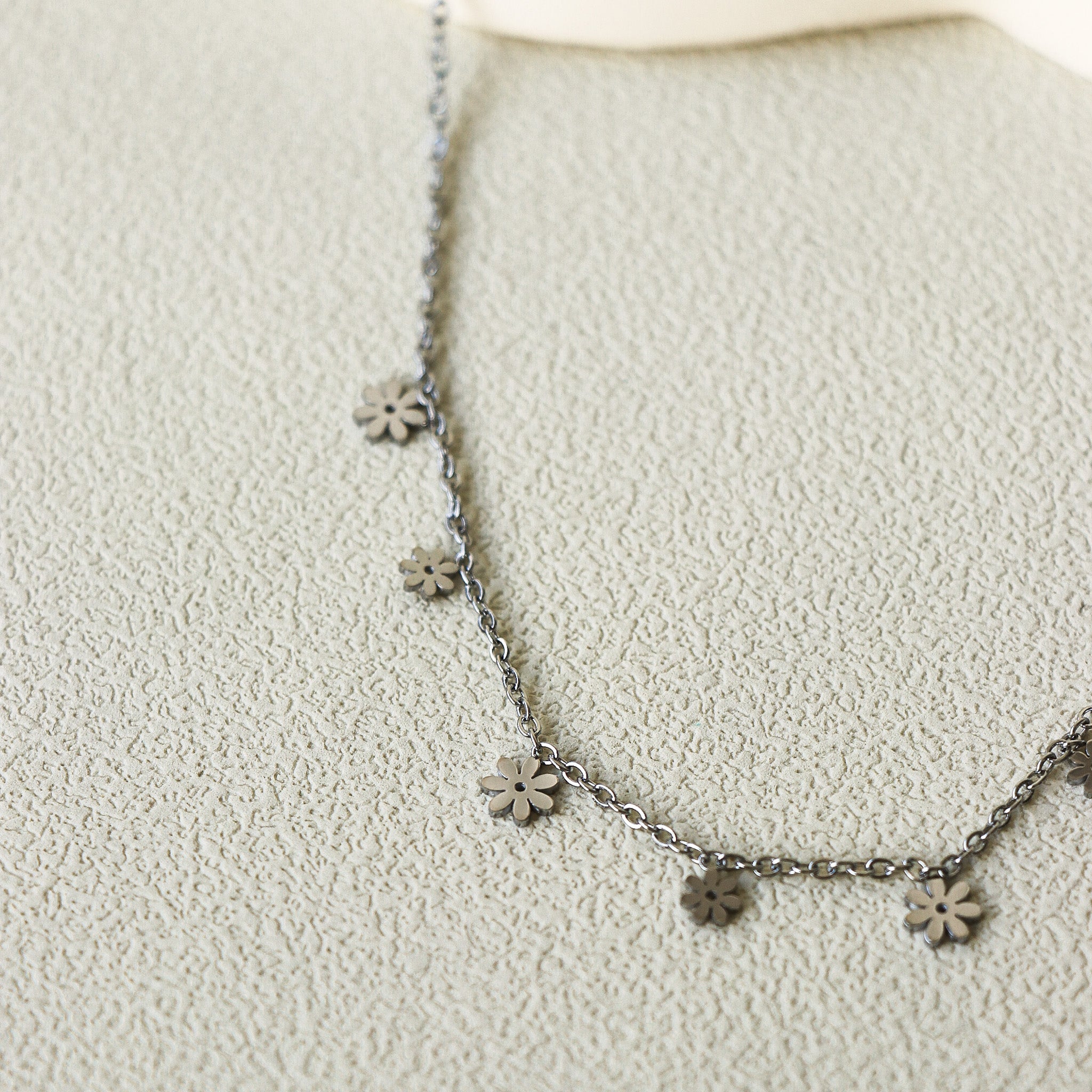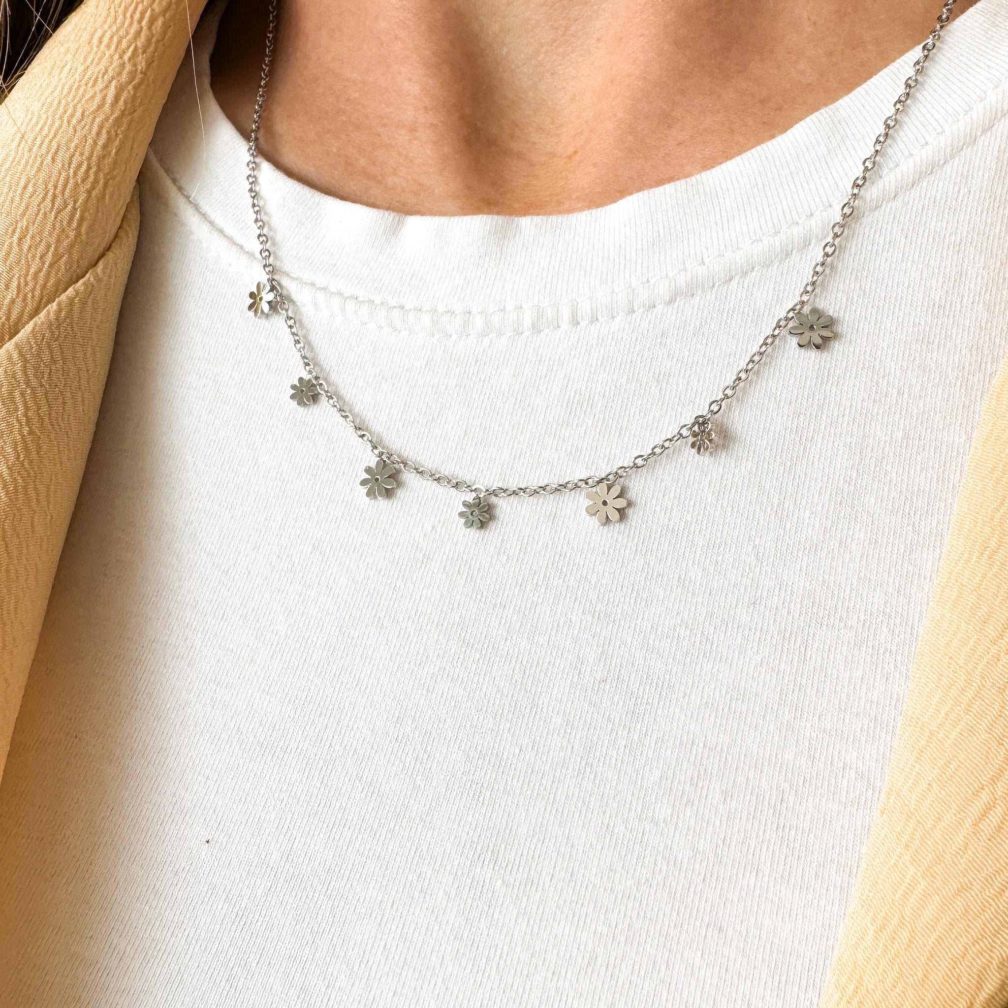 Delicate necklace adorned with seven small flowers of varying sizes. Water-resistant, you can wear it anytime, on the beach or on a picnic.