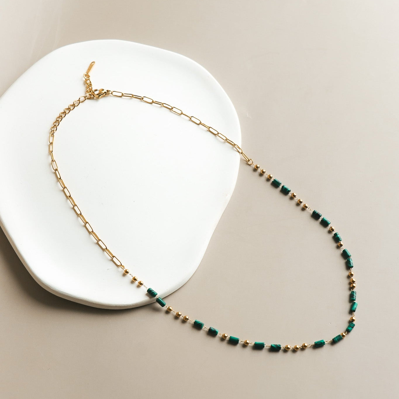 Necklace composed of a chain and a natural malachite stone. Add a touch of color to your style with this delicate necklace.