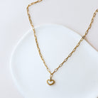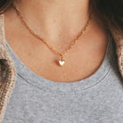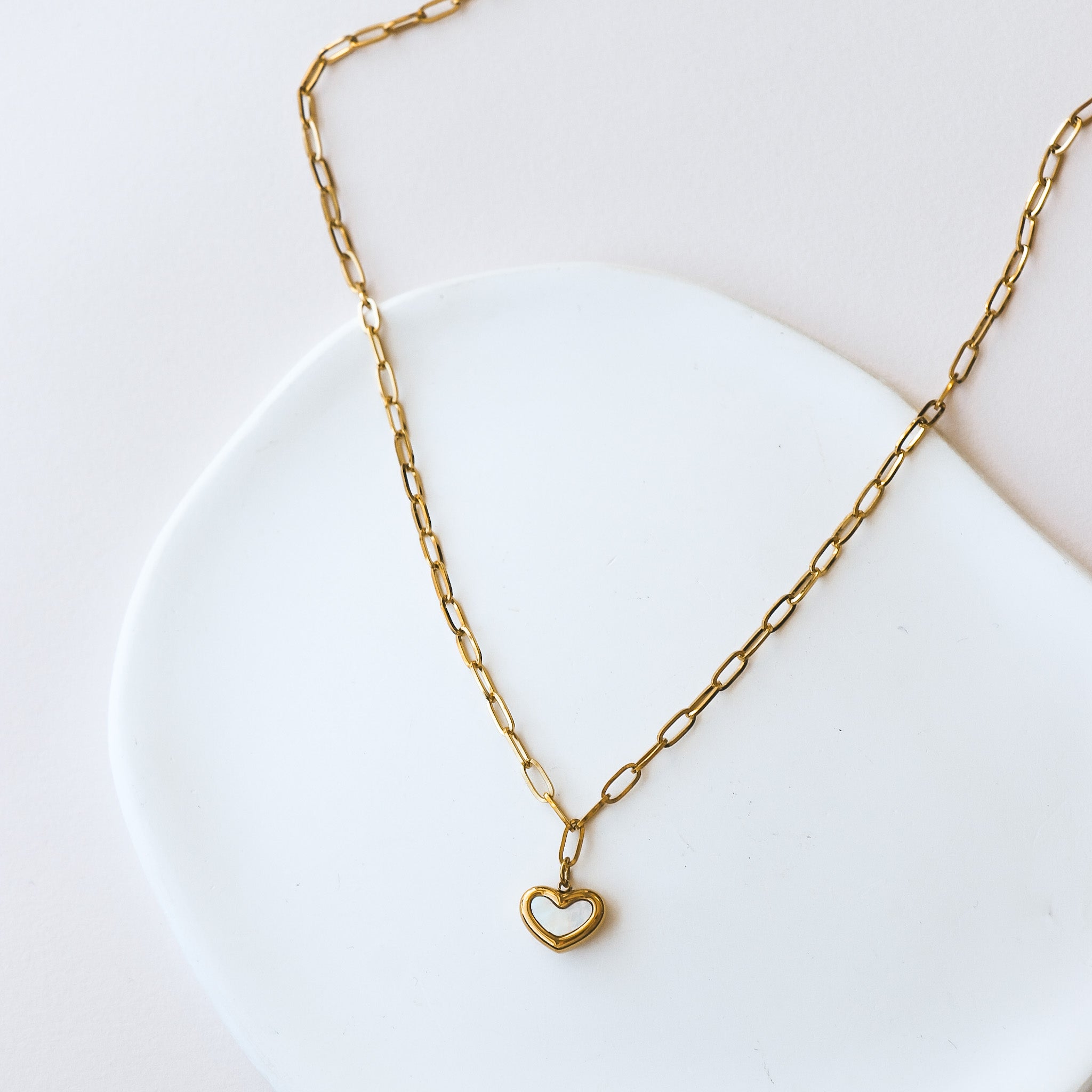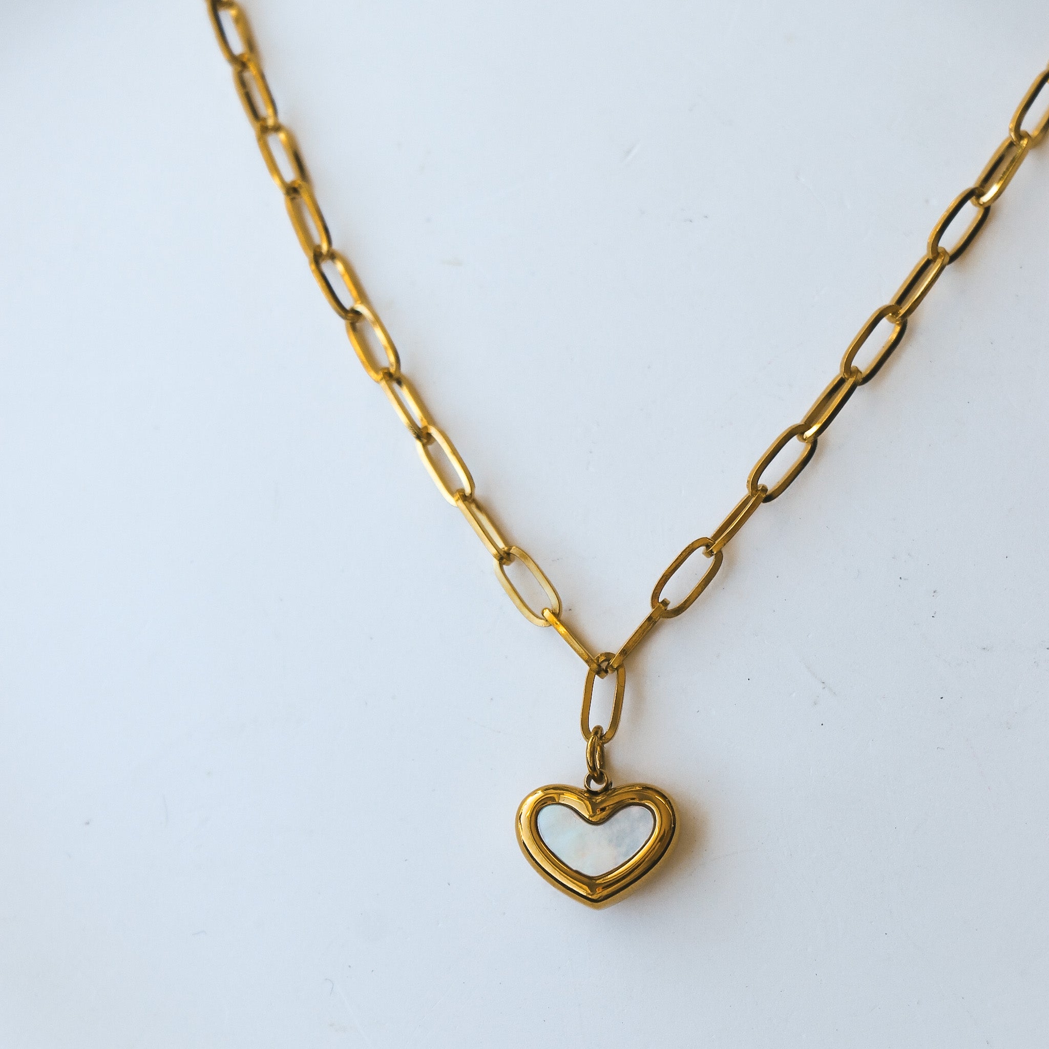 Necklace composed of an oval link chain with a heart-shaped pendant and mother-of-pearl in the center.