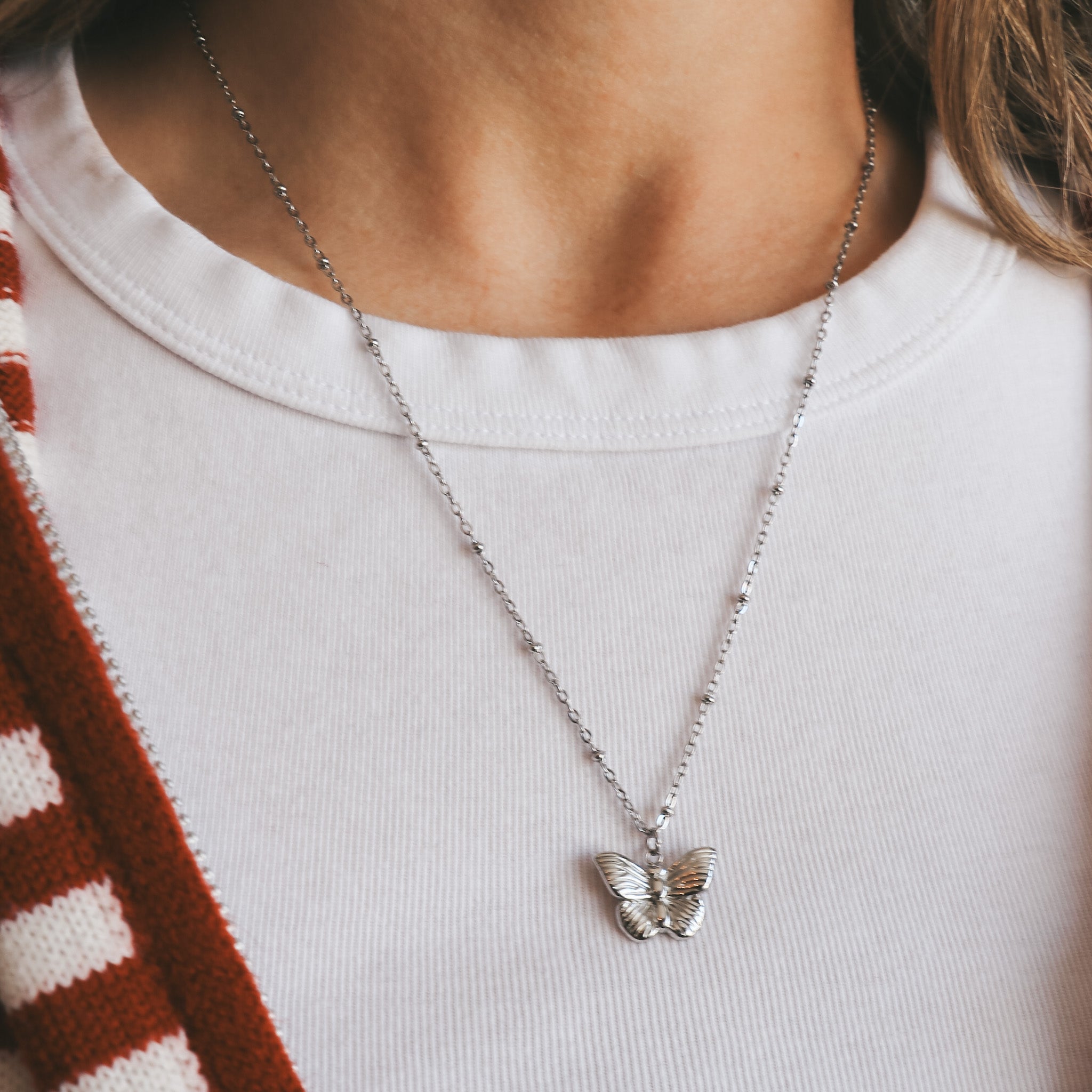 Necklace composed of a satellite chain and a butterfly pendant. Show off your style with this necklace that evokes summer.