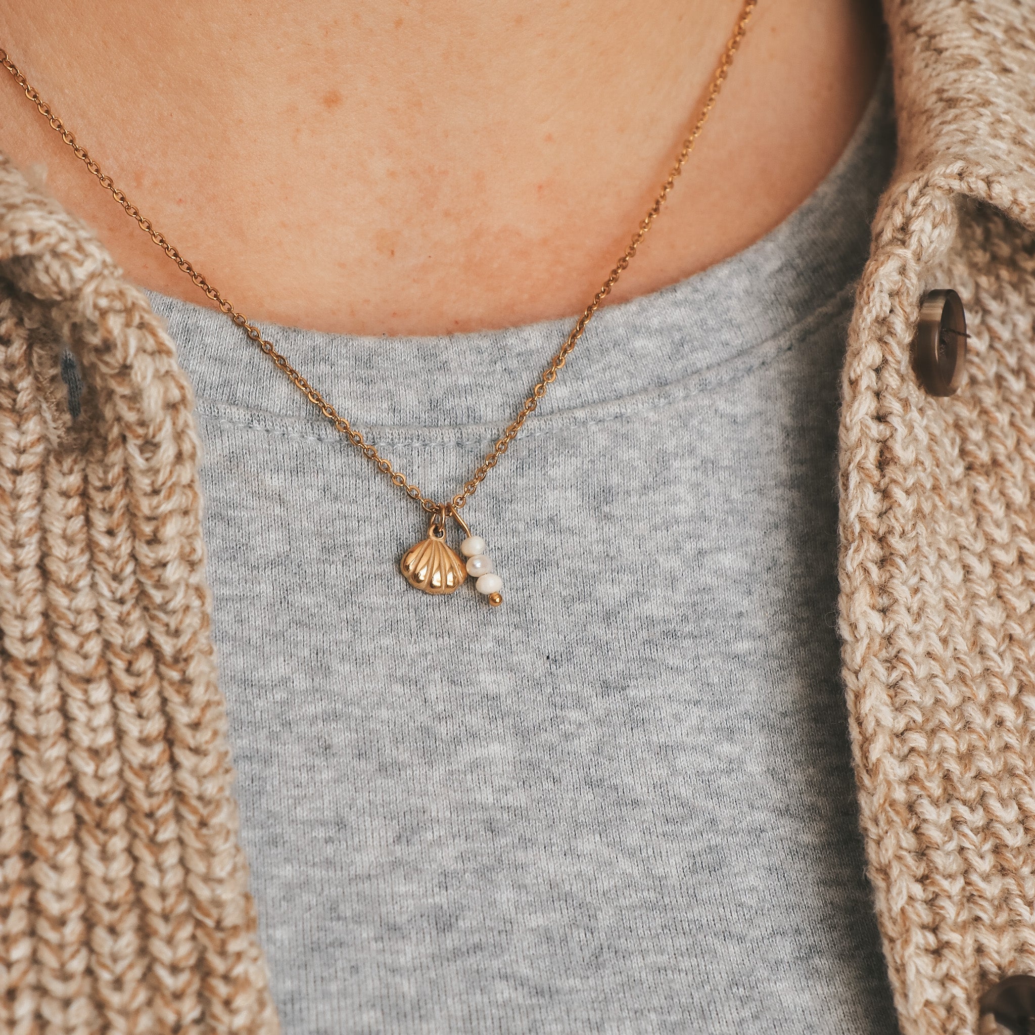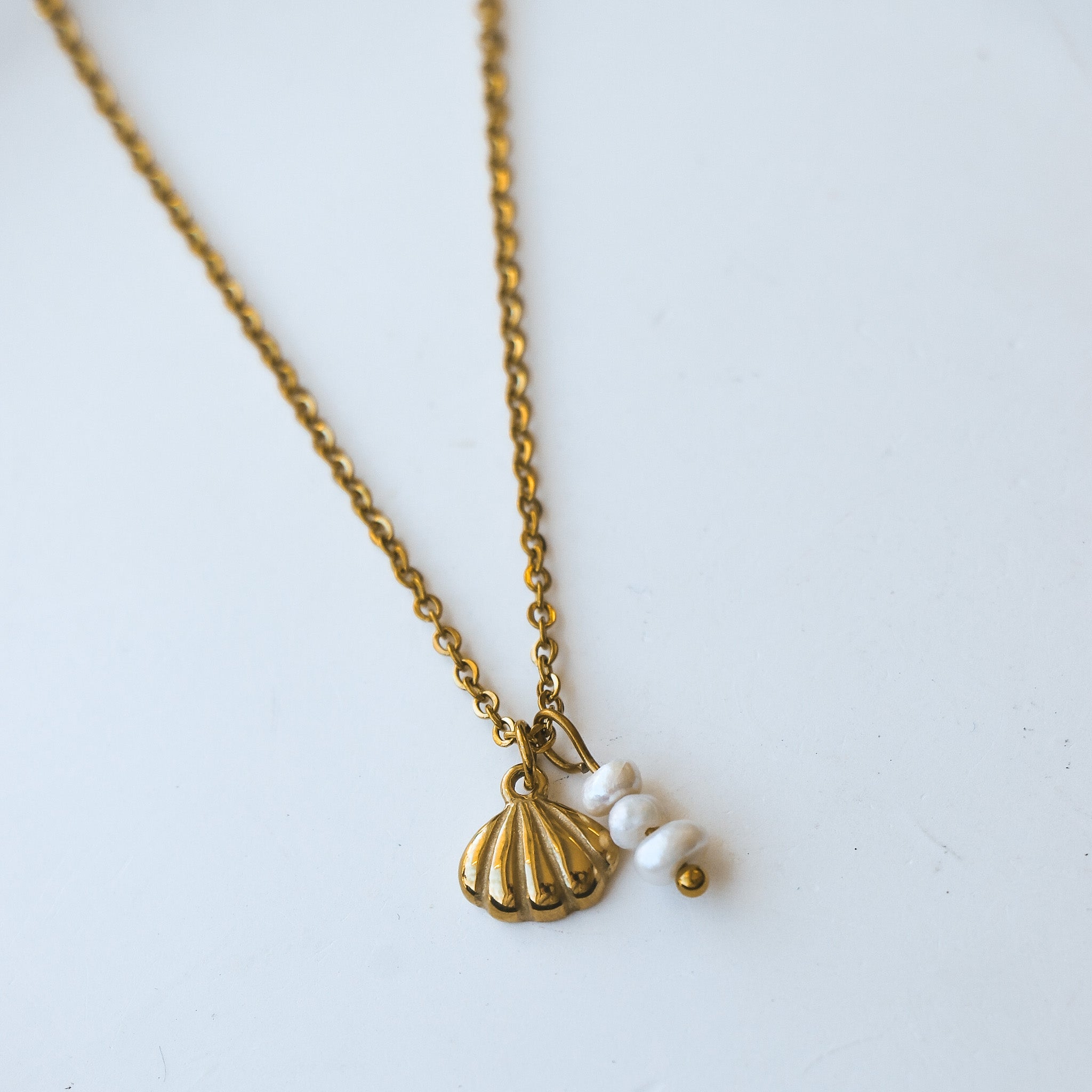 Necklace composed of a shell-shaped pendant and three small freshwater pearls. It can be worn alone or layered with other necklaces.