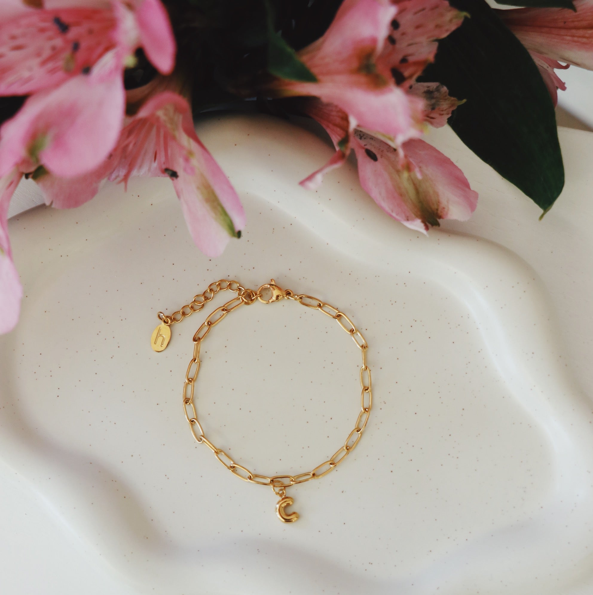 Bracelet with links in the shape of small paper clips and a pendant of a letter of the alphabet of your choice.