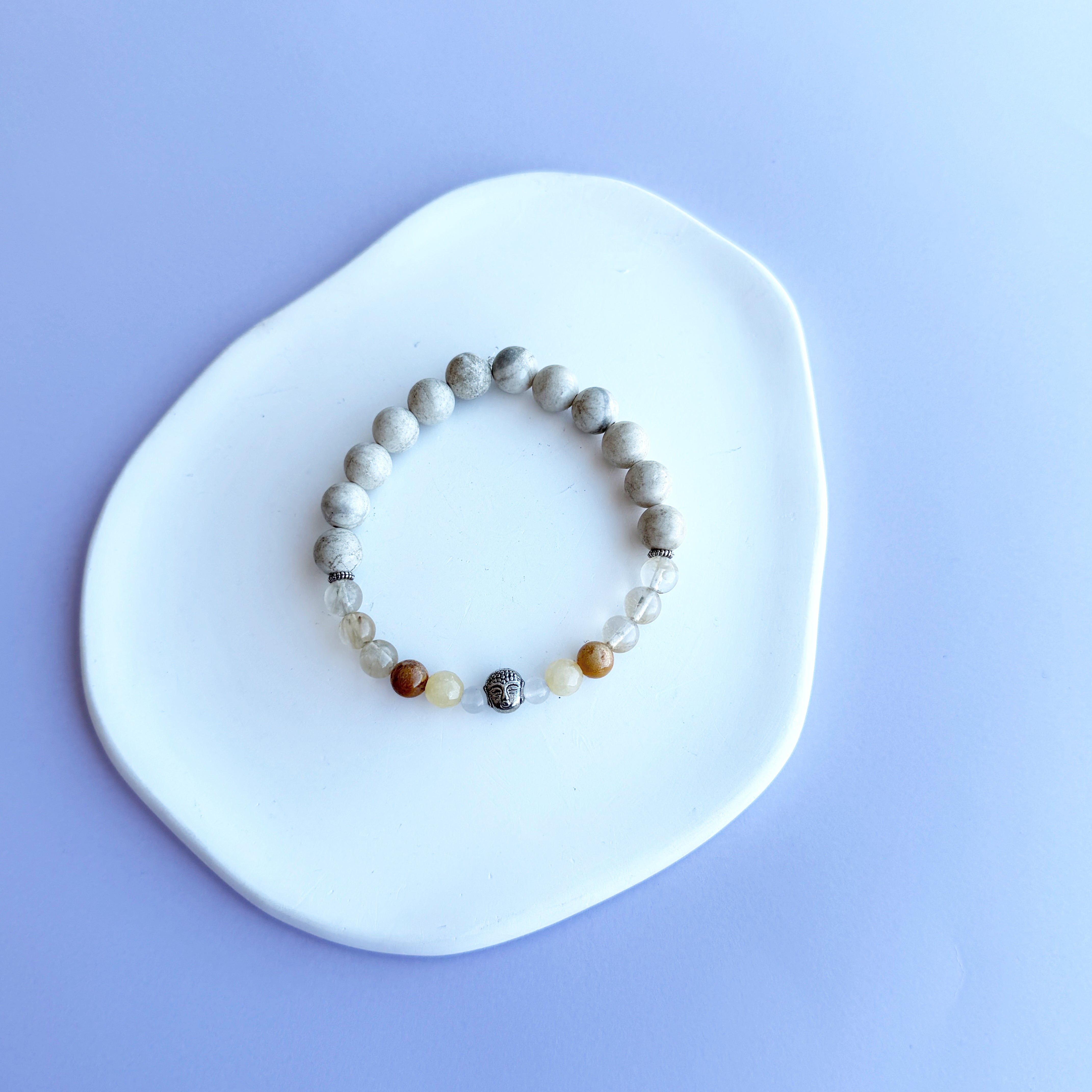 Bracelet made of mixed natural stone beads in shades of grey and beige. Features a small Buddha head bead and silver-colored details. Elastic cord.