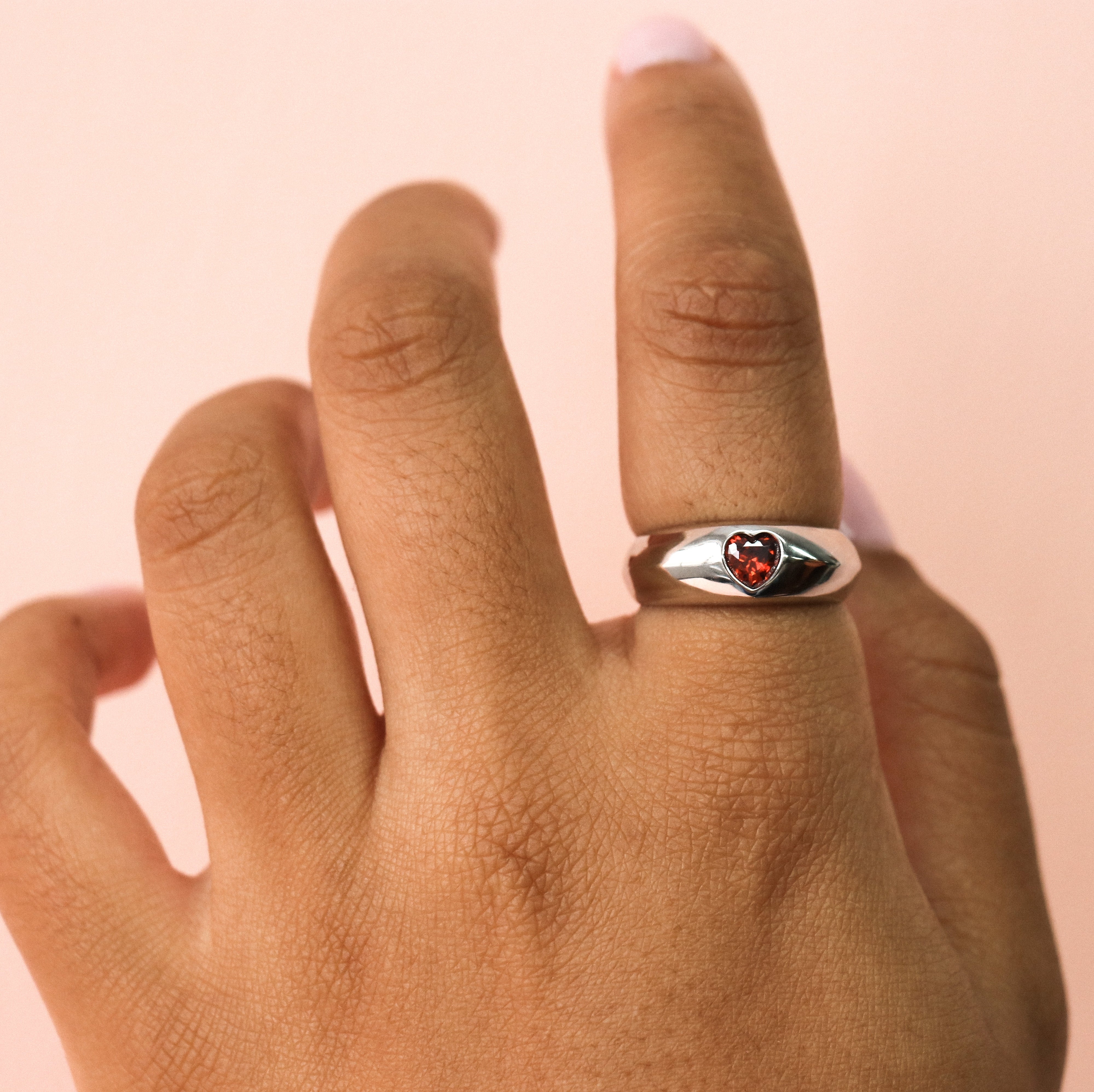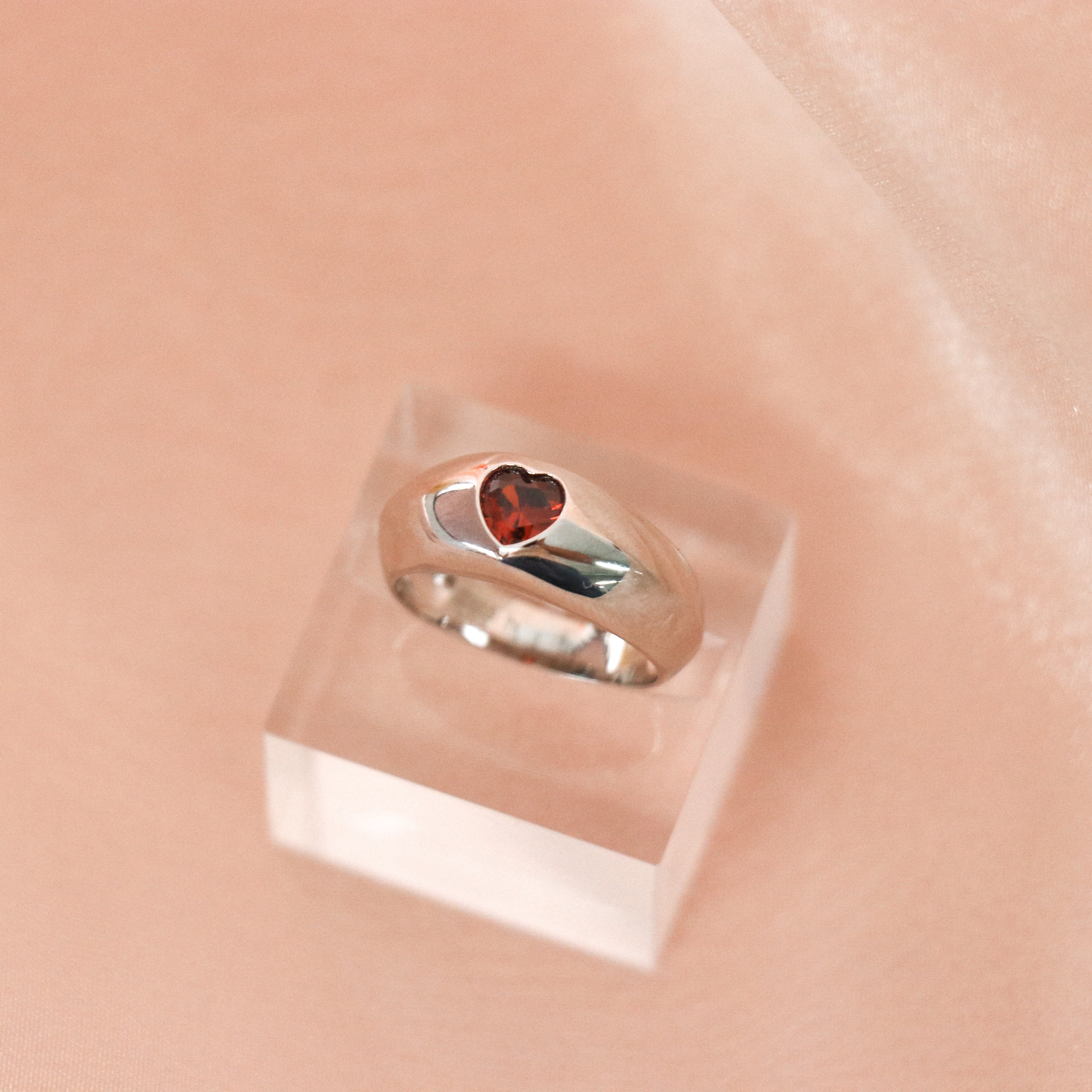 Dome type ring adorned with a garnet colored zircon in the shape of a heart.
