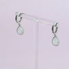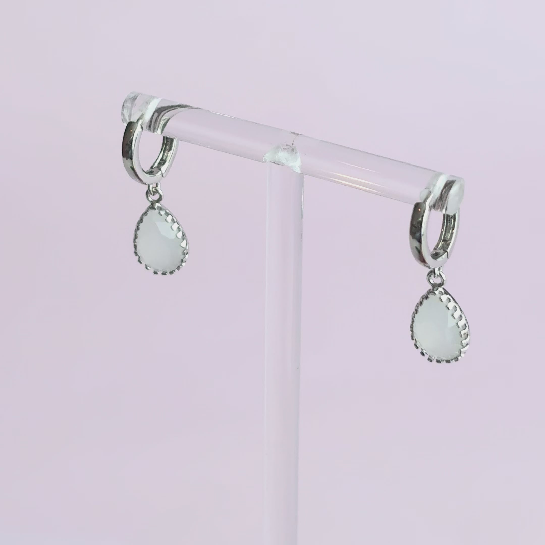 Sleeper earrings adorned with a drop-shaped pendant in cream-colored glass stone.