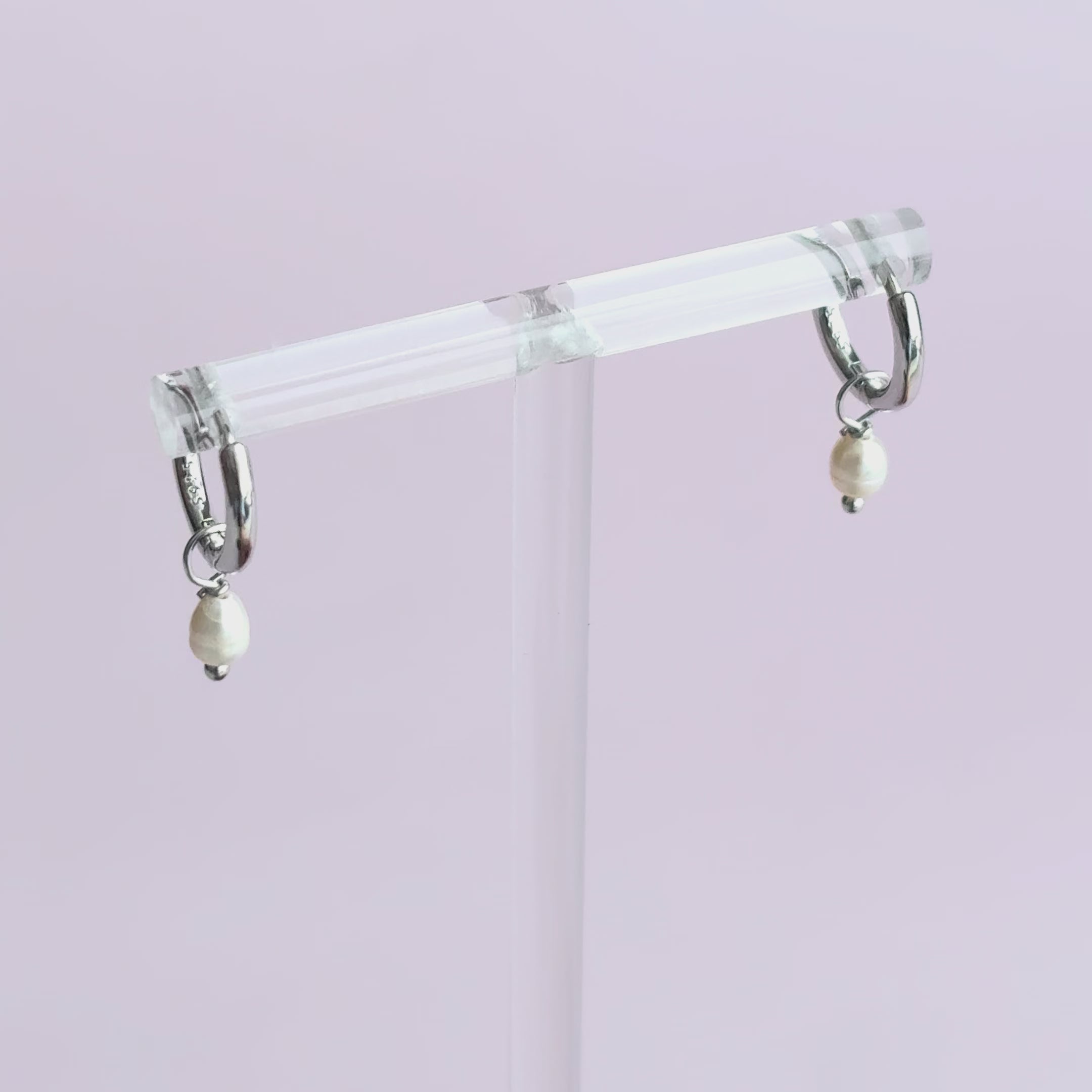 Sleeper hoop earrings adorned with a freshwater pearl.