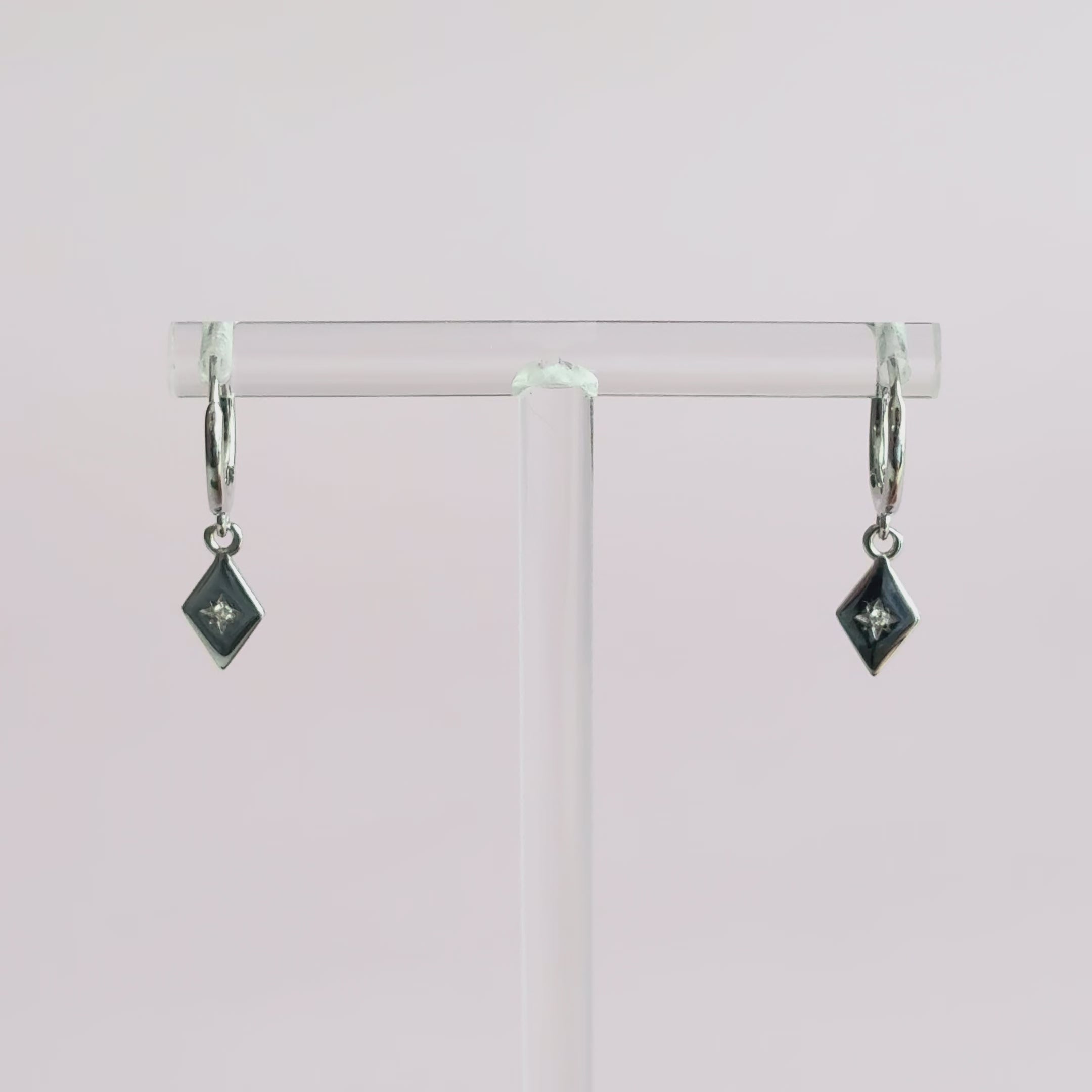 Delicate hoop earrings with diamond pendant and small inlaid zircon.